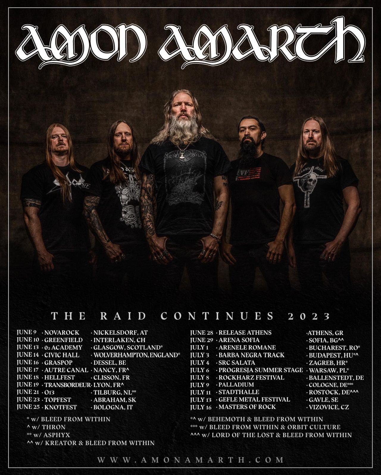 Os vikings metaleiros suecos AMON AMARTH têm uma série de concertos em nome próprio e datas de festivais mesmo aí à porta, muitos dos quais contam com os BLEED FROM WITHIN como banda de abertura. A denominada The Raid Continues 2023, vai manter a banda na estrada entre Junho e Julho, sobretudo no norte da Europa e, infelizmente, sem qualquer espectáculo marcado para a Península Ibérica. Podes conferir a rota completa em baixo, com a banda a fazer o primeiro concerto já no próximo dia 13 de Junho, em Glasgow, na Escócia, e o último a decorrer a 16 de Julho. A 2 de Agosto, Johan Hegg e companhia dão início a uma tour do outro lado do Atlântico, onde vão manter-se até Setembro. O 12.º álbum dos intrépidos vikings da música extrema, que carrega o título «The Great Heathen Army», foi editado a 5 de Agosto de 2021 através da Metal Blade Records. Gravado com o reputado produtor e músico Andy Sneap nos controlos, o sucessor de «Berserker» mostrou outro salto ousado por parte do grupo, que operou mais uma revisão hábil e evolutiva na sua sonoridade, tanto em termos líricos como musicais. Desde a barulhenta «Find A Way Or Make One» ao assalto aos sentidos que é «Get In The Ring», passando ainda pela fúria evocativa de «Saxons & Vikings» e pela atmosfera cinemática do tema-título, «The Great Heathen Army» encapsula na perfeição a essência desta lendária banda, ao mesmo tempo que a mostra a explorar uma série de ideias novas.