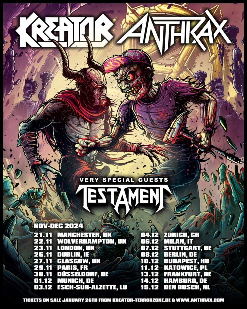 O Sr. Mille Petrozza já nos tinha prometido um anúncio capaz de deixar qualquer thrasher satisfeito, pois bem… Aqui está ele!!! Os pioneiros ANTHRAX e KREATOR vão juntar forças numa digressão europeia que vai percorrer o Velho Continente durante o Outono de 2024 e, para tornar as coisas ainda um pouco mais interessantes, a jornada conta também com a participação dos não menos lendários TESTAMENT como convidados especiais.