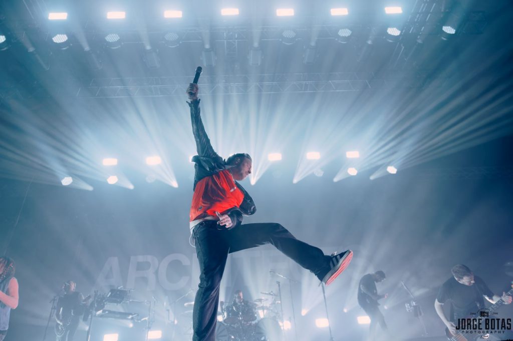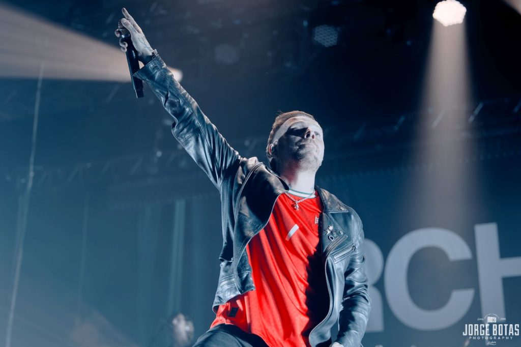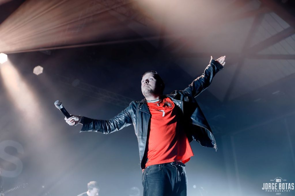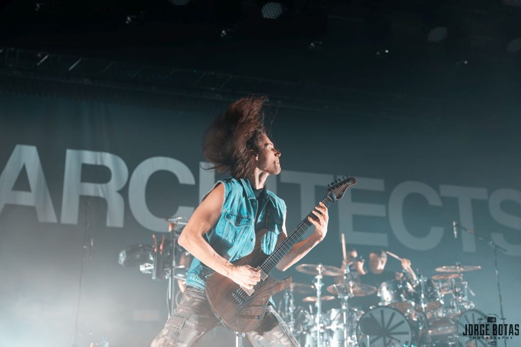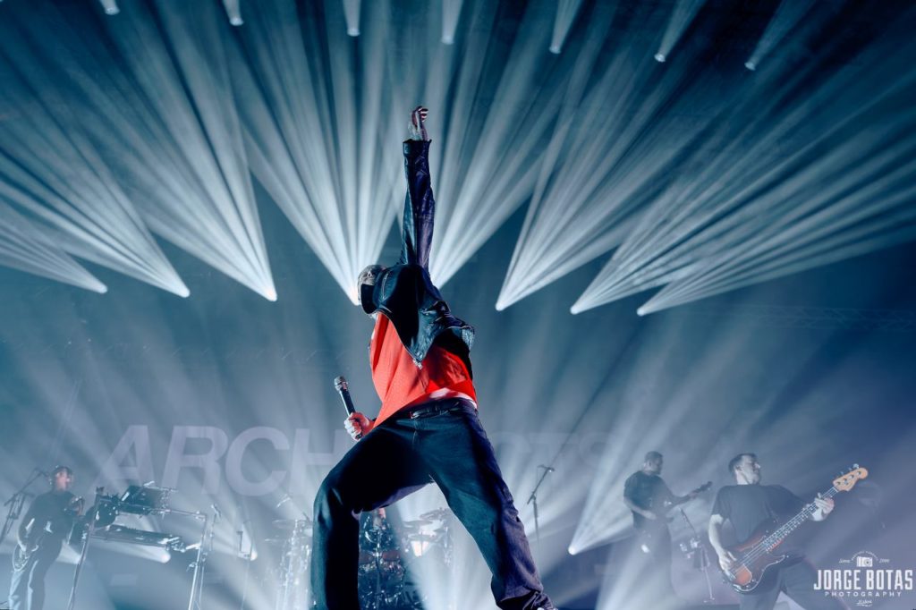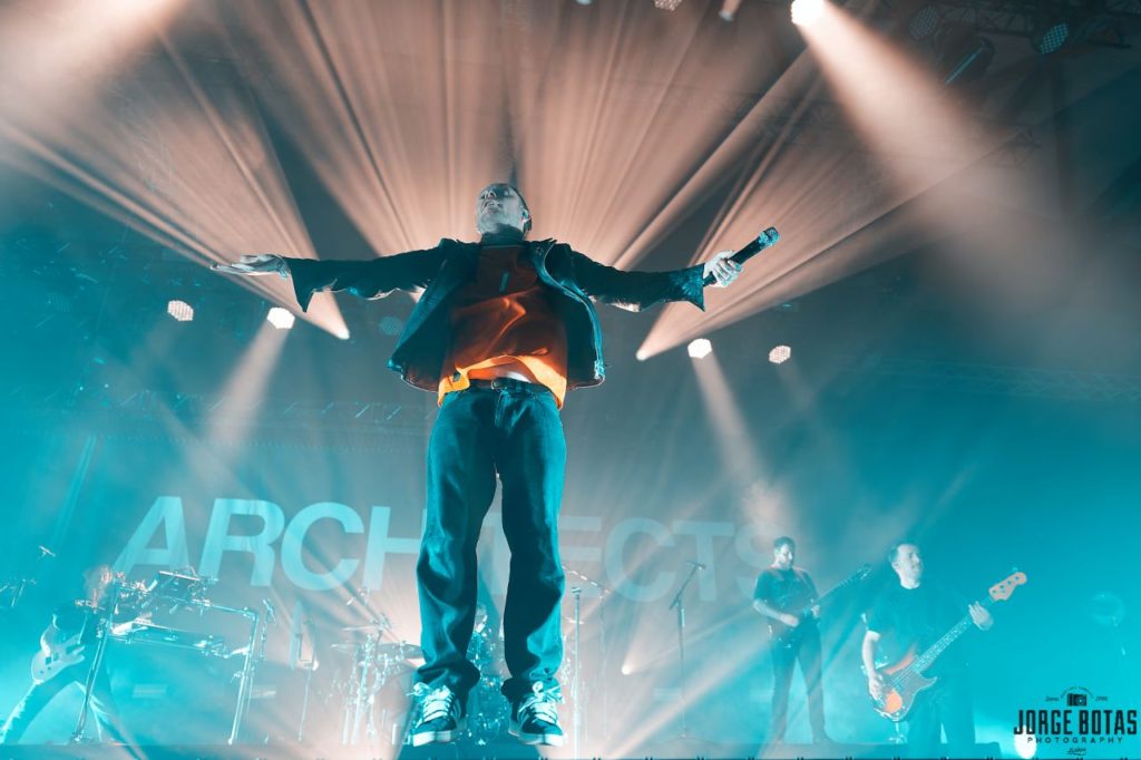 Quando os ARCHITECTS surgiram finalmente sob um mar de luz branca, a euforia foi imediata. «when we were young» abriu o concerto com uma força devastadora, lançando de imediato o público num estado de euforia colectiva. A combinação de guitarras afiadas, bateria incessante e os berros carregados de emoção de Sam Carter criaram uma tempestade sonora que fez tremer a Sala Tejo.