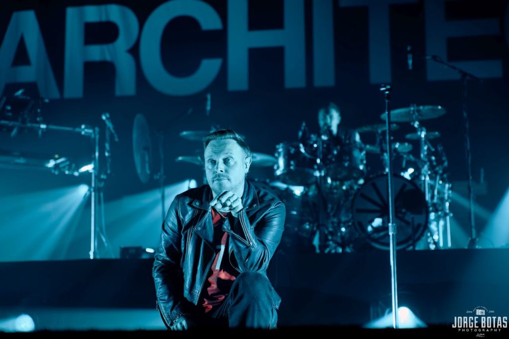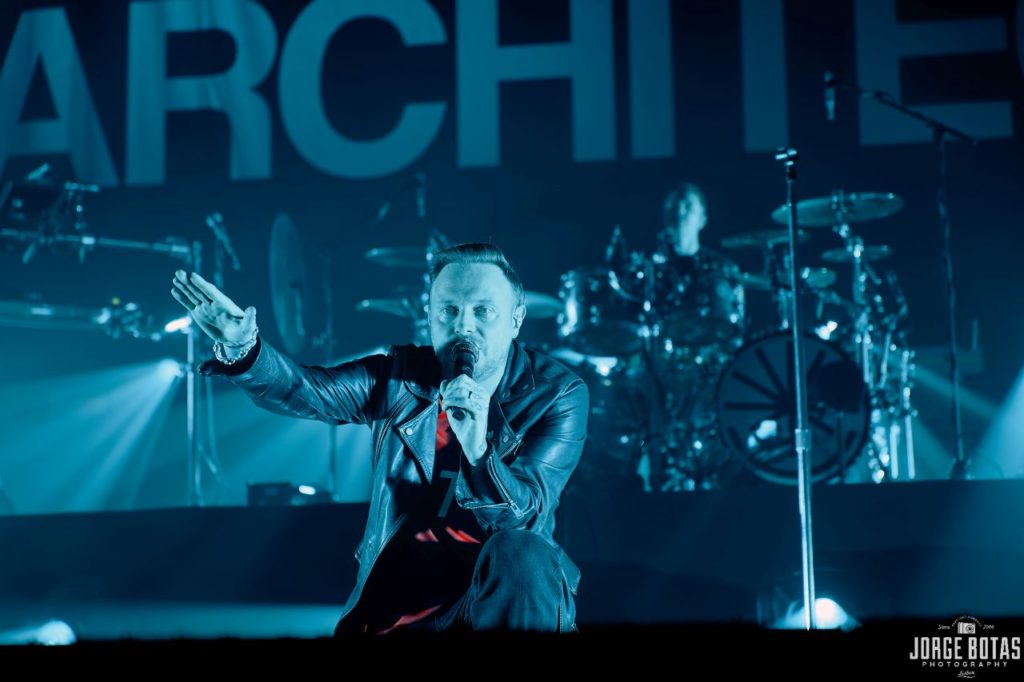 Com o aproximar das 22:00, o ambiente na Sala Tejo sofreu uma transformação palpável. O público sabia o que estava para acontecer — e o primeiro acorde de «Don’t Stop Me Now», dos QUEEN, a brotar do PA confirmou todas as expectativas. A escolha dos ARCHITECTS para o momento que antecedeu a entrada em palco não foi inocente — a energia contagiante do clássico fez o público soltar os primeiros gritos e deu início ao primeiro coro em uníssomo, ainda antes da banda aparecer em cena.