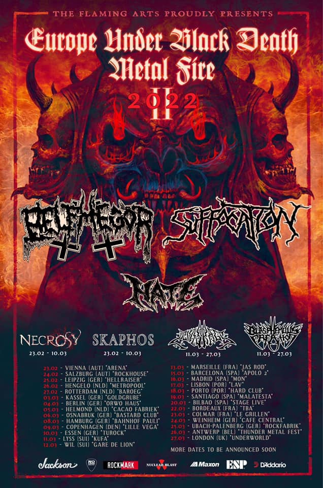 Corria o Inverno de 2020 e os concertos sucediam-se. Ainda alguém se recorda? De repente, a Europa parou, e a digressão dos BELPHEGOR, SUFFOCATION e HATE foi apanhada inevitavelmente na confusão. Datas canceladas, problemas a atravessar fronteiras, até que, poucos dias antes de chegar a Portugal, a rota foi mesmo cancelada. Depois de umas primeiras datas anunciadas ainda para finais de 2021, com os BATUSHKA, eis que num esforço conjunto da Larvae Records, Notredame Productions e Nightfear Productions se conseguem novamente se assegurar duas datas para Portugal, sendo a primeira a 17 de Março, no LAV – Lisboa Ao Vivo, e a 18 de Março, no Hard Club, no Porto. Na parte da digressão em que as datas nacionais estão incluídas, aos três nomes juntam-se ainda os DEVIL’S RAGE. Entretanto, os BELPHEGOR não têm estado parados e, no final do ano passado, reeditaram «Necrodaemon Terrorsathan», originalmente editado em 2000. O disco recebeu um novo tratamento, com alguns temas regravados e também melhorados. Rumores referem ainda que outros trabalhos posteriores irão sofrer o mesmo tratamento.