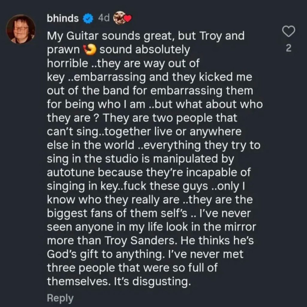 Hinds aproveitou a ocasião para disparar novas críticas aos MASTODON: “A minha guitarra soa muito bem, mas o Troy e o prawn [a alcunha que, aparentemente, usa para Brann Dailor] soam absolutamente horríveis… Estão completamente desafinados. Chega a ser embaraçoso. Eles expulsaram-me da banda por os envergonhar por ser quem sou… mas, e quem são eles? São duas pessoas que não conseguem cantar… Nem estúdio nem ao vivo. Tudo o que tentam cantar no estúdio é manipulado com autotune porque são incapazes de cantar afinados… que se lixem. Só eu sei quem eles realmente são. São os maiores fãs de si próprios”.