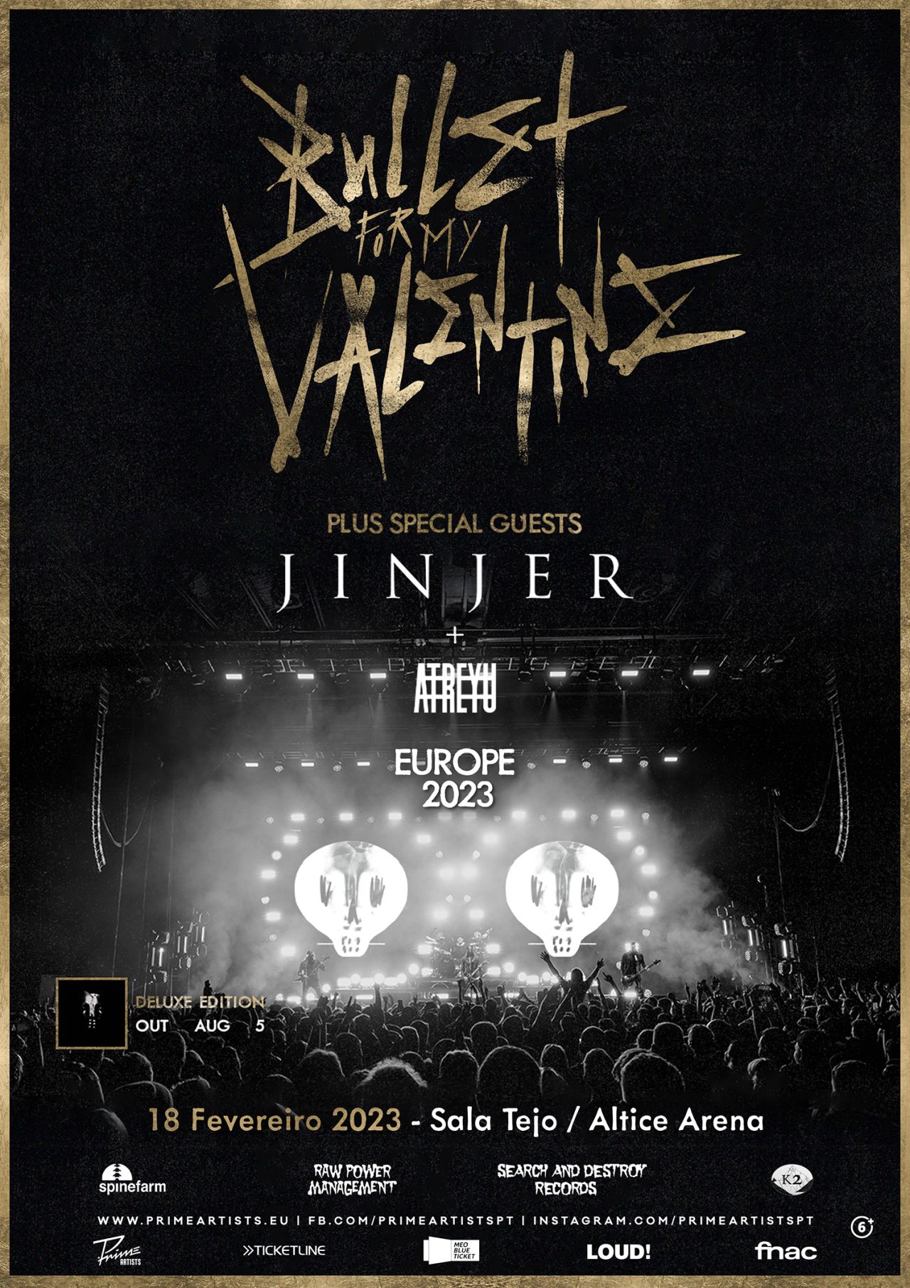 Os muitíssimo aplaudidos BULLET FOR MY VALENTINE vão voltar à estrada no início do próximo ano para uma colossal tour europeia de promoção ao seu mais recente álbum, «Bullet For My Valentine», que foi reeditado em Abril numa versão expandida com temas inéditos e novo grafismo. O disco, já o sétimo de longa-duração para a banda liderada pelo carismático Matt Tuck, foi editado em plena pandemia e vai servir de mote a uma rota pelo velho continente, que traz pela primeira vez a Portugal os músicos galeses. A banda estreia-se em solo nacional com uma actuação na Sala Tejo da Meo Arena, em Lisboa, agendada para 18 de Fevereiro de 2023. Na bagagem, o quarteto – cuja formação fica completa com Tuck na guitarra e na voz, Michael “Padge” Paget na guitarra solo, Jamie Mathias no baixo e Jason Bowld na bateria – traz não só uma demolidora coleção de novas canções, mas também “suporte” de luxo, a cargo dos JINJER e dos ATREYU.
