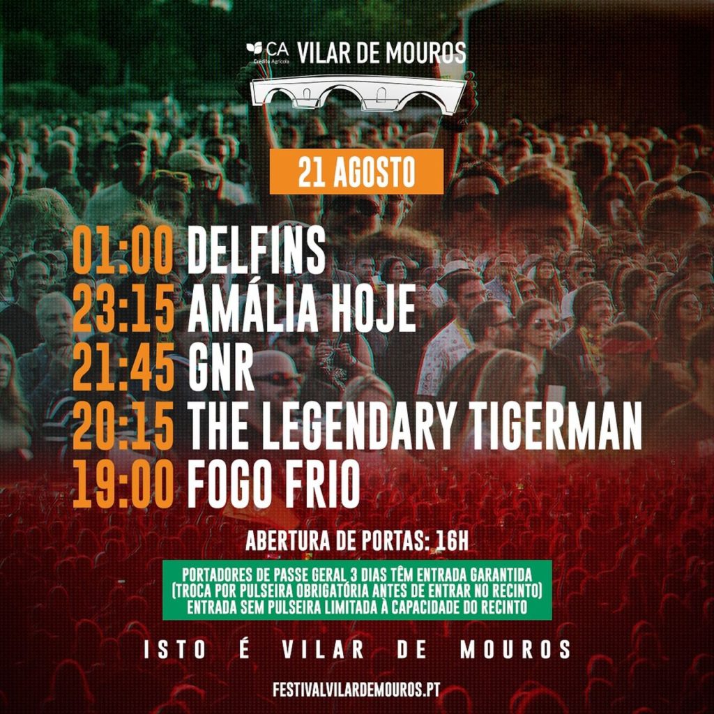 DELFINS, AMÁLIA HOJE, GNR, THE LEGENDARY TIGERMAN e FOGO FRIO actuam hoje, quarta-feira, 21 de Agosto, o dia de celebração com entrada gratuita. O acesso ao recinto não requer o levantamento de qualquer bilhete, mas está obviamente limitado à capacidade do espaço. Portadores de passe geral têm acesso garantido pela organização, desde que troquem o seu bilhete por pulseira antes de entrarem no recinto. As bilheteiras estão abertas diariamente entre as 14:00 e a 01:00.