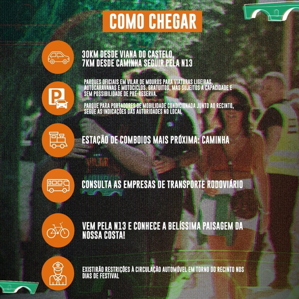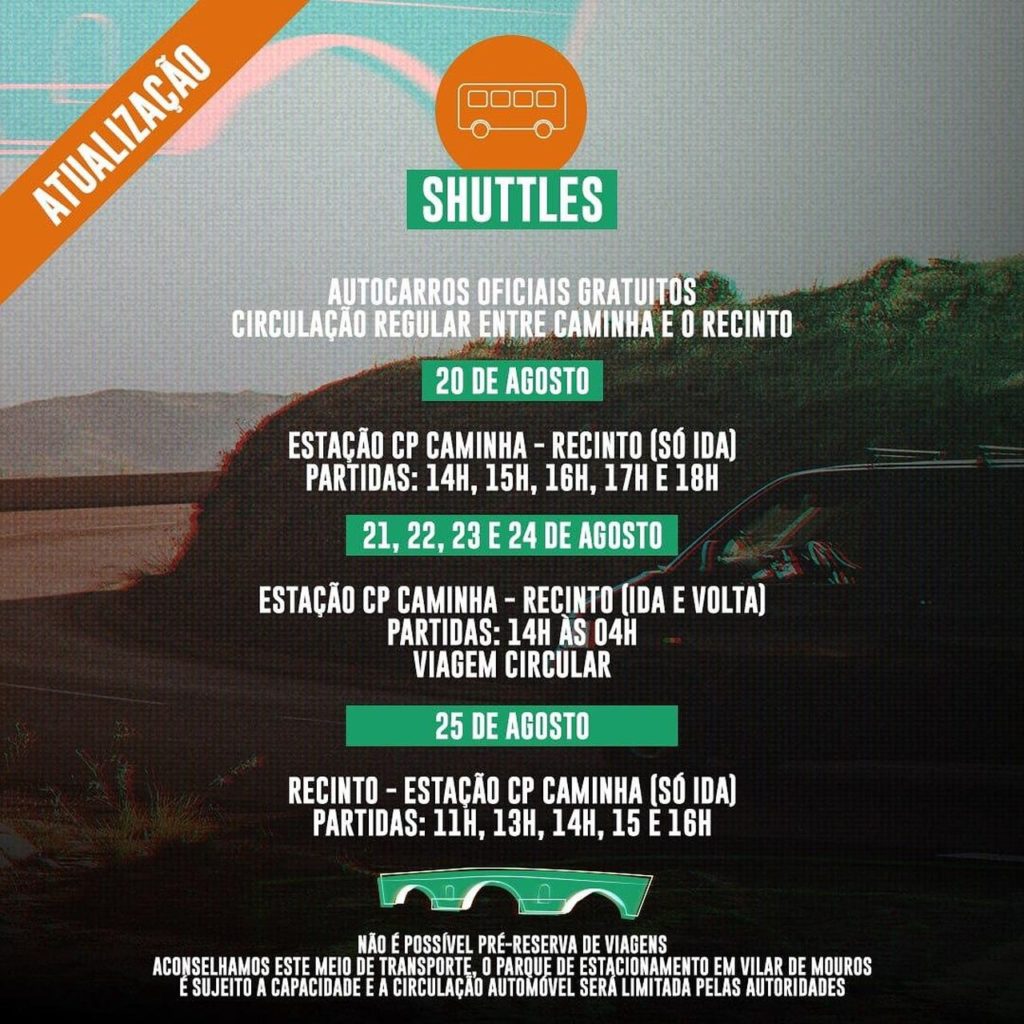 O CA VILAR DE MOUROS disponibiliza, uma vez mais, shuttles gratuitos e regulares, em circulação entre a Estação de Comboios de Caminha e o recinto (e no percurso inverso), entre os dias 21 e 24 de Agosto, com partidas previstas a cada 30 minutos a partir das 14:30 (em Caminha). A última viagem de cada dia inicia-se no recinto, meia hora após o final do último concerto. Importa também recordar que, em Vilar de Mouros, existem vários parques de estacionamento gratuitos, e devidamente sinalizados, para carros ligeiros e autocaravanas.