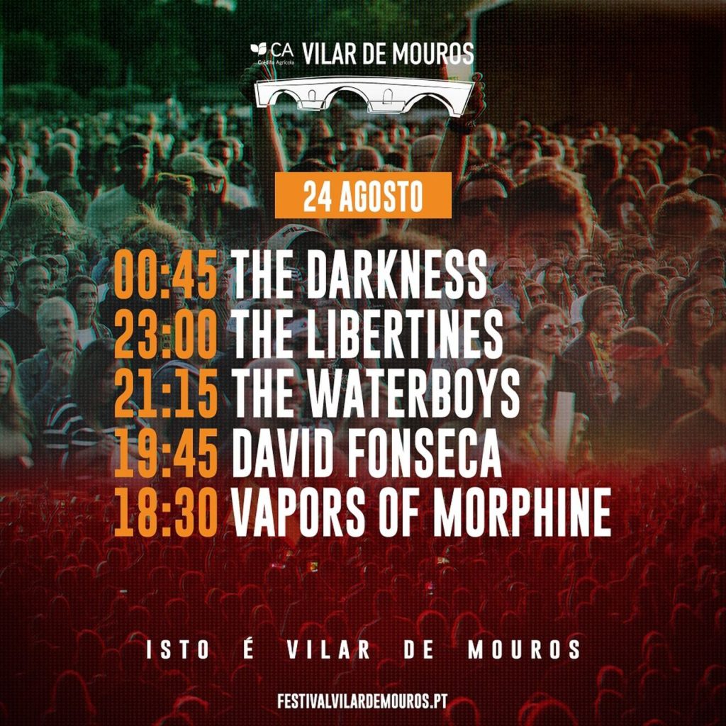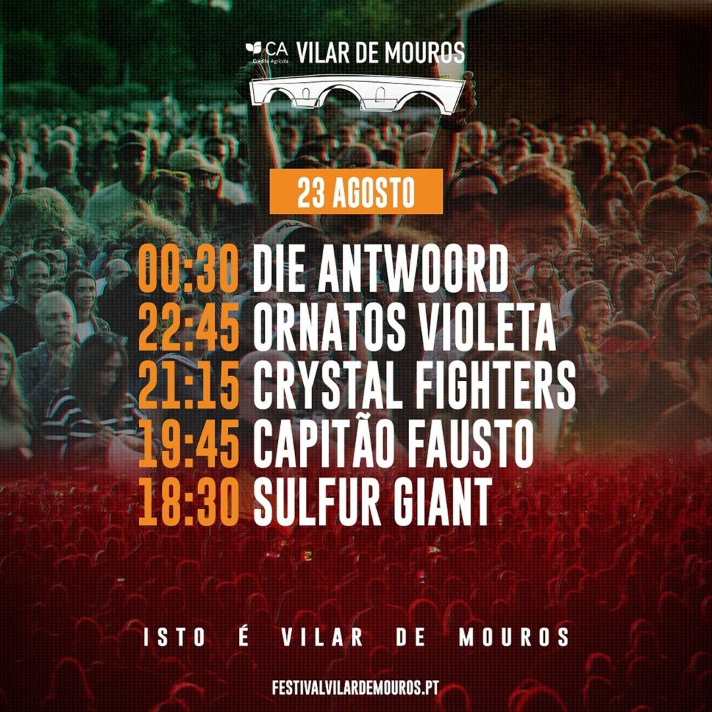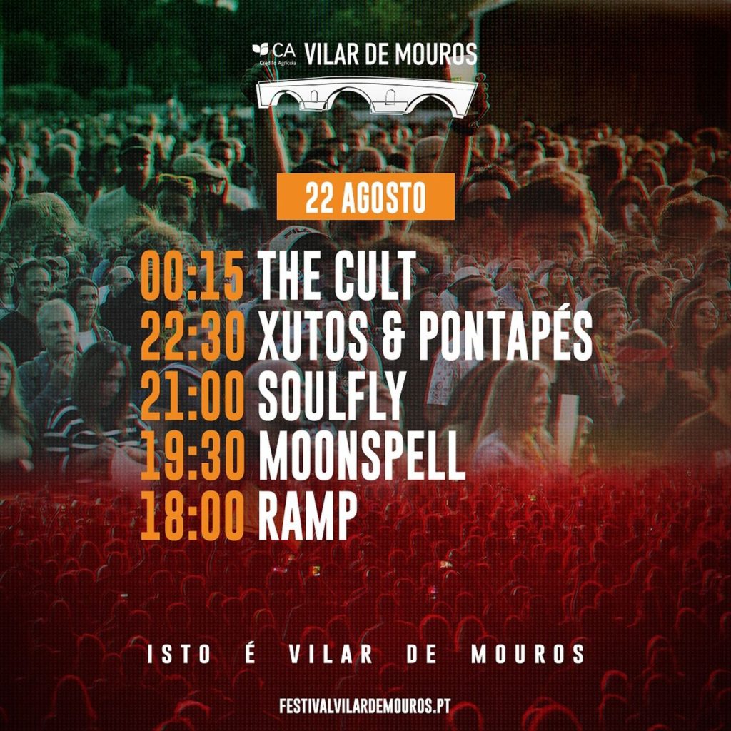Nos dias 21, 22, 23 e 24 de Agosto, o mítico CA VILAR DE MOUROS volta a, esperançosamente, receber milhares de festivaleiros. Esta que é a segunda edição consecutiva com quatro dias apresenta um cartaz diversificado. Fiel à raiz rock, pelo palco irão passar nomes icónicos da música nacional e internacional, com o cartaz a contar com a participação dos THE CULT, SOULFLY. THE DARKNESS, THE LIBERTINES, THE WATERBOYS, DIE ANTWOORD, XUTOS & PONTAPÉS, ORNATOS VIOLETA, CRYSTAL FIGHTERS, VAPORS OF MORPHINE, CAPITÃO FAUSTO, DAVID FONSECA, RAMP, MOONSPELL e SULFUR GIANT.