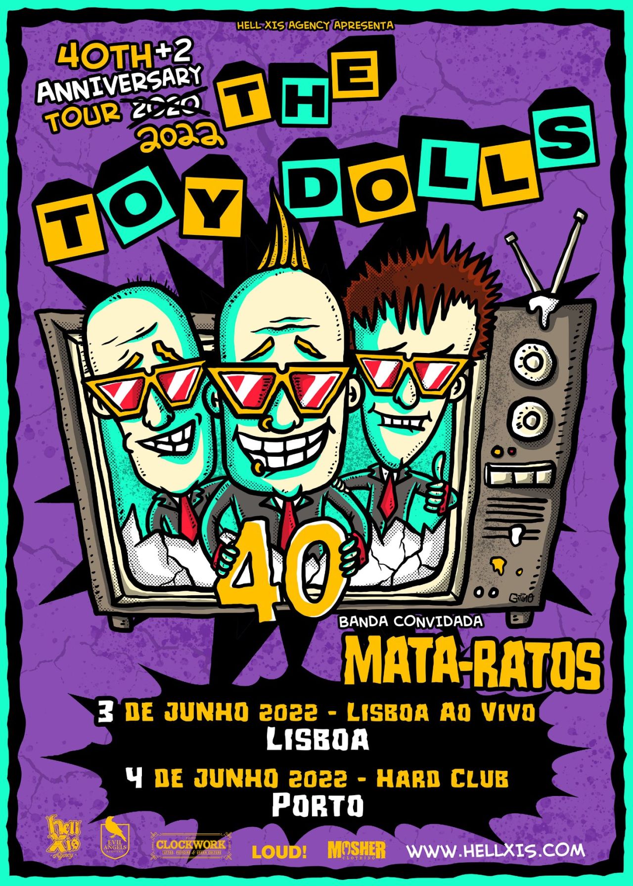 Está iminente a visita dos THE TOY DOLLS ao nosso país para uma data-dupla há muito aguardada (e adiada algumas vezes também devido ao que todos nós sabemos). A lendária banda britânica passa primeiro pelo LAV – Lisboa Ao Vivo, na capital, a 3 de Junho e, de seguida, sobe ao Hard Club, no Porto, a 4 de Junho. A acompanhar os icónicos músicos britânicos temos os “nossos” MATA-RATOS, que também andam a comemorar os quarenta anos de carreira. Pois bem, aí temos um bom motivo duplo para celebrarmos a longevidade de duas bandas lendárias — embora no caso dos THE TOY DOLLS sejam na verdade 40 + 2, uma vez que a celebração devia ter acontecido dois anos atrás. A abordagem desconcertante e descontraída do grupo britânico sempre foi um factor de diferenciação em relação ao que tinha ficado como herança da cena mítica de ’77, assim como a imagem de marca dos óculos escuros que todos os membros da banda usam. Dos primórdios até agora, apenas Michael “Olga” Algar se manteve como único membro original, mas apesar de alguma instabilidade com a entrada e saída de membros, os THE TOY DOLLS já se mantêm com a mesma formação há mais de quinze anos. «Episode XIII», de 2019, continua a ser o último álbum de originais mas prevê-se que os concertos desta digressão sejam um desfilar de clássicos. Os MATA-RATOS também se encontram em digressão pelo país a celebrar quatro décadas de carreira de forma incansável e a espalhar o seu charme. A banda portuguesa lançou recentemente — numa edição limitada a 200 unidades — o livro «Manifesto De Combate», que traz como oferta uma cassete de «Kamikazes Da Infâmia», além de terem também disponibilizado uma caixa de metal com quatro palhetas exclusivas numa edição também limitada (desta vez a 40 unidades). Podem adquirir os bilhetes para estes espectáculos aqui.
