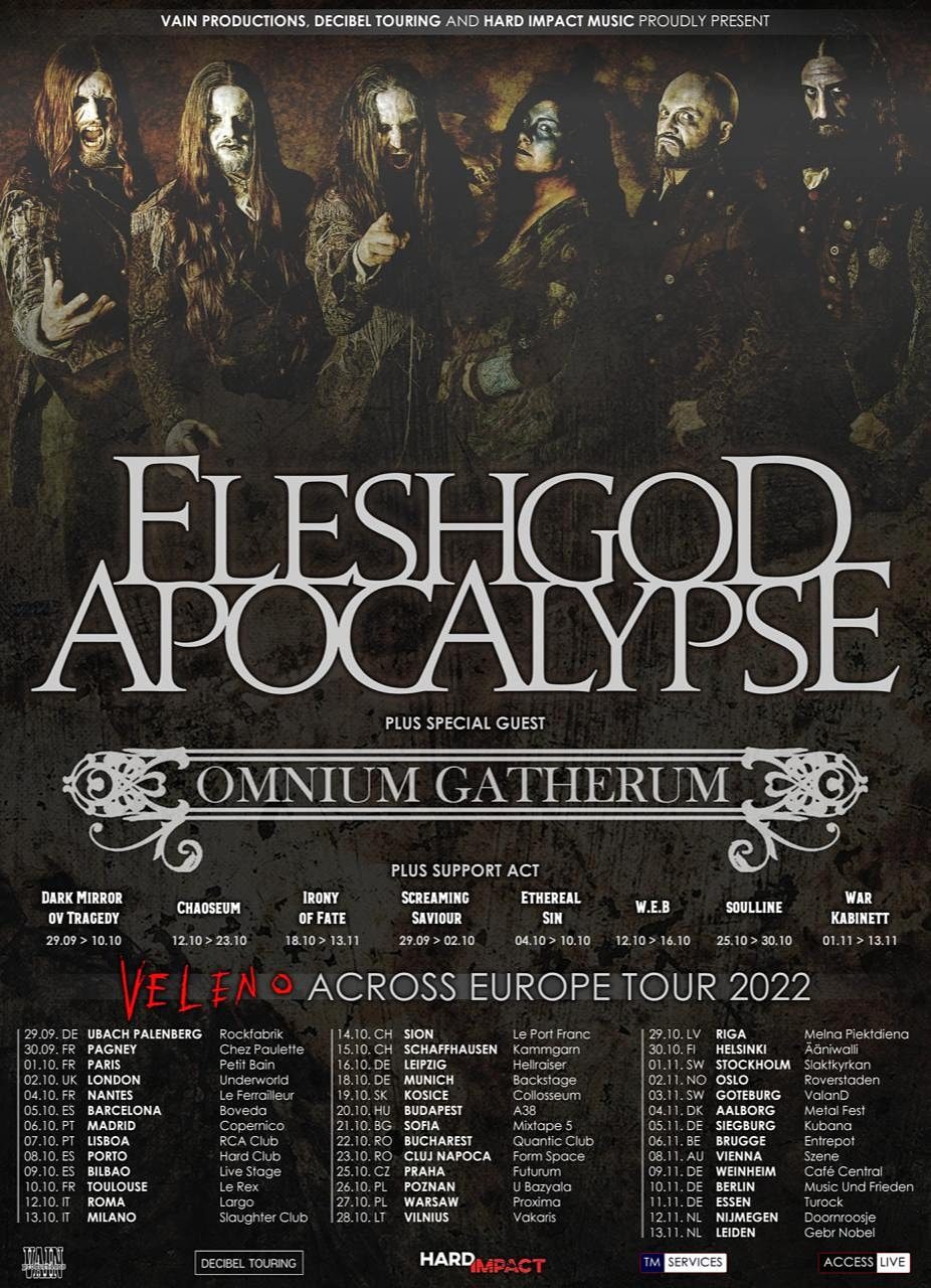 Os FLESHGOD APOCALYPSE anunciaram finalmente o reagendamento da digressão europeia originalmente agendada para o Outono de 2020 e, claro, no roteiro constam as duas datas em Portugal adiadas por força da pandemia. Depois de ter passado pelo LAURUS NOBILIS MUSIC no Verão de 2019, a banda italiana regressa assim ao nosso país nos dias 7 e 8 de Outubro de 2022, para actuar no RCA Club e no Hard Club, em Lisboa e no Porto, respectivamente. A digressão, intitulada Veleno Across Europe 2022, conta com os finlandeses OMNIUM GATHERUM como convidados especiais. «Veleno», o mais recente álbum dos FLESHGOD APOCALYPSE, foi lançado no dia 24 de Maio de 2190, pela Nuclear Blast Records. O disco, cujo título significa “veneno” em italiano, marcou o primeiro lançamento do grupo em três anos, desde a edição do aclamado «King», em 2016. A parte “metal” de «Veleno» foi gravada em Roma, Itália, no Bloom Recording Studio e no Kick Studio com o colaborador de longa data Marco Mastrobuono, enquanto as partes orquestrais foram captadas no Musica Teclas Studio em Perugia. Depois, os temas foram misturados e masterizados por Jacob Hansen nos seus Hansen Studios, na Dinamarca. Toda a produção de «Veleno» demorou, segundo Paoli, cerca de três meses. A arte final para a capa do album foi criada por Travis Smith, famoso pela associação aos AVENGED SEVENFOLD, OPETH e KATATONIA, entre outros.