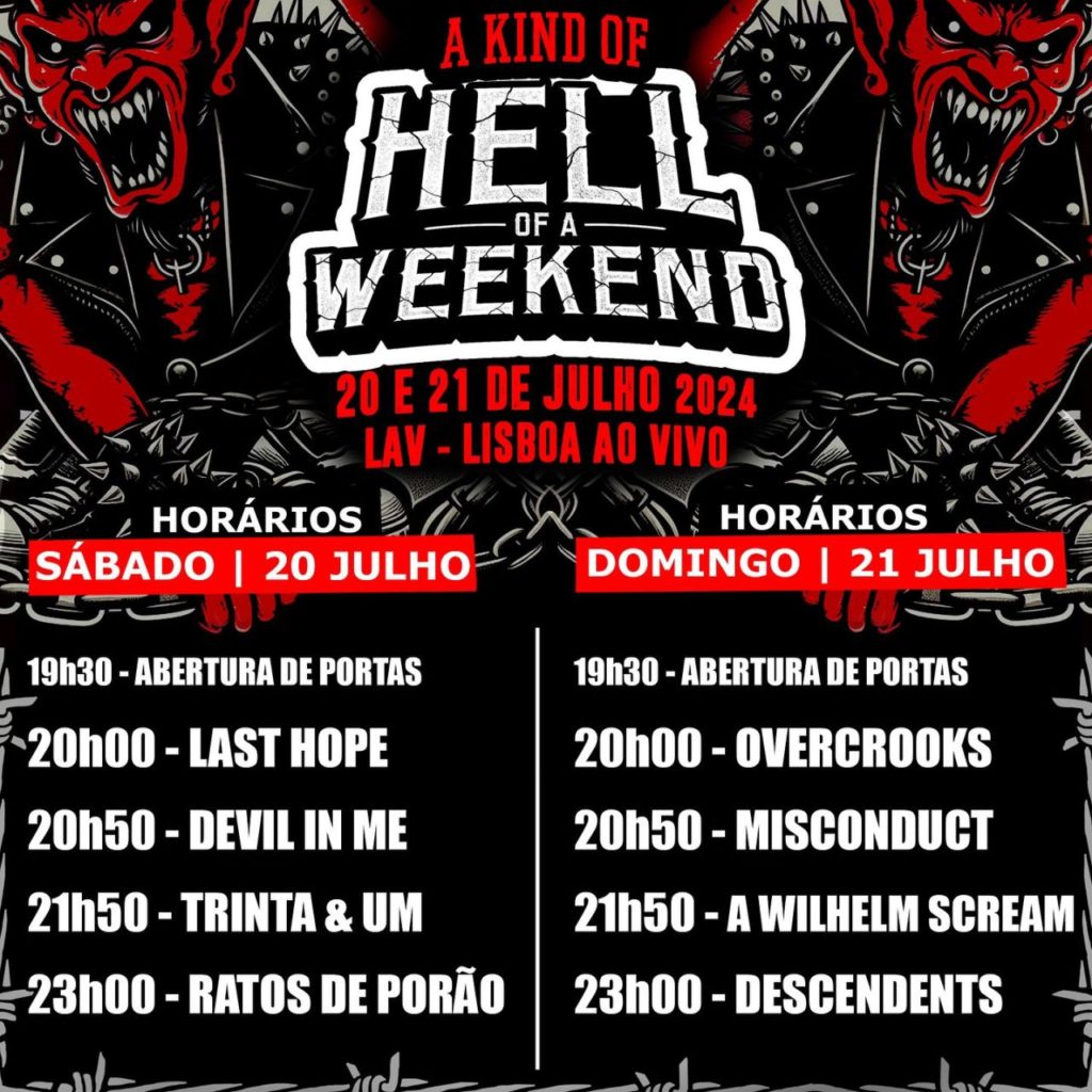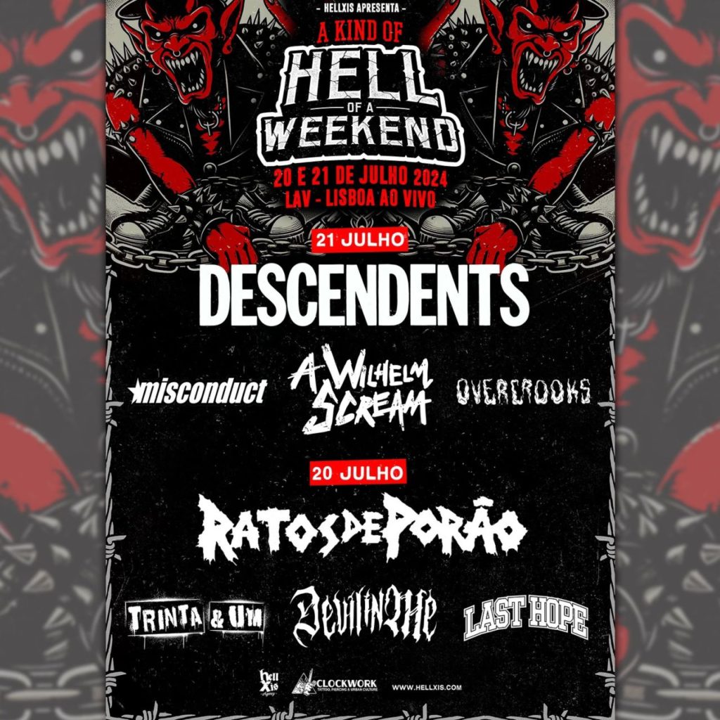 O Hell Of A Weekend, festival organizado pela Hell Xis, vai regressar finalmente em 2024 após um hiato de seis anos. O evento regressa ao LAV – LIsboa Ao Vivo nos dias 20 e 21 de Julhoe conta com as lendas DESCENDENTS e RATOS DE PORÃO como cabeças de cartaz. Também com presença confirmada os norte-americanos A WILHELM SCREAM, os suecos MISCONDUCT e os nacionais TRINTA & UM, DEVIL IN ME, LAST HOPE e OVERCROOKS.