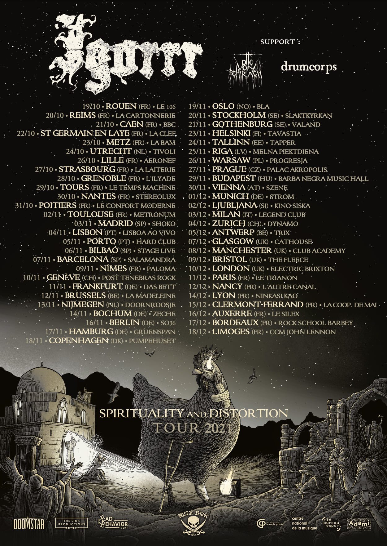 Estas datas fazem parte da Spirituality and Distortion Tour, composta por 53 (!) datas e que vai levar o projecto francês a percorrer quase todo o velho continente. «Spirituality And Distortion», o mais recente álbum dos IGORRR, foi editado em Março de 2020 pela Metal Blade Records, tendo entrado na tabela de vendas em países como a Suíça e a Alemanha. Mais informações em relação aos espectáculos em Lisboa e Porto serão disponibilizadas em breve.