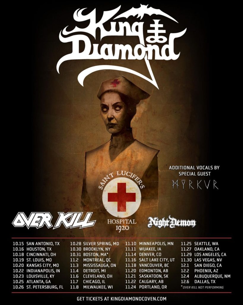 Para esta rota, KING DIAMOND vai contar com os préstimos da conterrânea MYRKUR, que, segundo ele, vai contribuir com teclados e vozes de apoio durante as suas actuações. “Bem-vindos ao Hospital de São Lúcifer, entrem por vossa conta e risco!“, declara Diamond num comunicado. “Tenho estado muito ocupado a compor esta história de horror em crescendo, que continua a evoluir. Eu já conheço o final, mas a viagem para lá chegar será longa. Há inúmeras personagens e coisas inesperadas ao longo desta jornada. Vão, por fim, conhecer esta família louca, numa outra linha do tempo que remete para 1920, onde enfrentei tempos difíceis.
