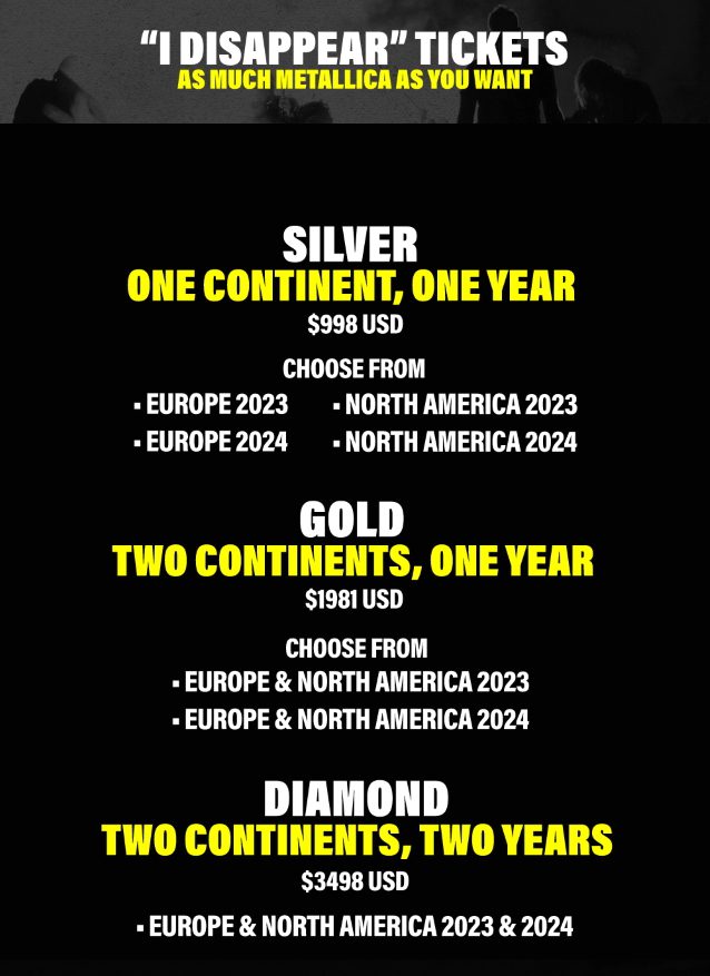 Os METALLICA já anunciaram os detalhes das “experiências melhoradas” para todos os espectáculos da sua próxima digressão mundial, e há cinco níveis à escolha com os preços a variarem entre os 400 e os 700 euros. Apresentada nos Estados Unidos pela Liquid Death e pela Blackened American Whiskey, e promovida pela Live Nation, a tour mundial ‘M72’ vai mostrar a banda de São Francisco a tocar duas noites em cada cidade onde parar — com cada uma destas No Repeat Weekend a apresentar dois alinhamentos e bandas de suporte completamente diferentes em cada noite. A rota contará com um novo e arrojado design de palco, que volta a colocar o famoso snakepit no centro do palco, bem como a estreia do passe ‘I Disappear’ para a digressão completa e a estreia de bilhetes com desconto para fãs com menos de 16 anos de idade. Cada uma destas datas-duplas oferece uma variedade de “experiências melhoradas”, que vão desde o acesso a um meet & greet, passando por uma visita guiada ao palco, comida e bebida no lounge “Black Box” e, claro, entrada antecipada no local dos espectáculos e no snakepit. O muito popular ‘Black Laminate’ está também de volta, mas agora sob a designação ‘I Disappear Ticket’, e é, segundo comunicado de imprensa, “o derradeiro bilhete para os fãs que querem dar uma escapadela de vários fins-de-semana com os Metallica“. De momento apenas estão à venda as “experiências melhoradas” de dois dias e não há planos para oferecer pacotes de um dia quando, a 20 de Janeiro de 2023, os bilhetes forem postos à venda. Recorde-se que, há uns dias, os METALLICA anunciaram a edição de um novo álbum, intitulado «72 Seasons».