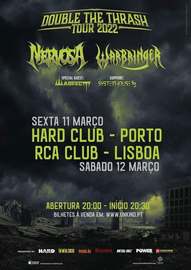 As “ainda” brasileiras NERVOSA regressam a Portugal em 2022. Um retorno que cheira mais a primeira vinda, pois será a oportunidade para Prika Amaral apresentar a nova formação do agora quarteto. À galega Diva Satânica, dos BLOODHUNTER, junta-se a baixista Mia Wallace, recorrentemente na banda de Abbath, e ainda a baterista Eleni Nota, dos LIGHTFOLD e MASK Of PROSPERO. Nesta ocasião, as autoras de «Perpetual Chaos», vêm acompanhadas dos norte-americanos WARBRINGER, no que também é um regresso a Portugal, dos suecos WARFECT e dos indianos SYSTEMHOUSE33. Um cartaz extenso, que certamente convencerá muitos fãs de thrash e death metal. Os concertos irão suceder-se em Porto e Lisboa, sendo a primeira data no Porto, a 11 de Março, uma sexta-feira, e em Lisboa no dia seguinte. A data portuense acontece, naturalmente, no Hard Club, enquanto a sessão lisboeta terá lugar no RCA Club. Os bilhetes para estes espectáculos já estão à venda na Unkind, estando a abertura de portas prevista para as 20:00 em ambos os dias.