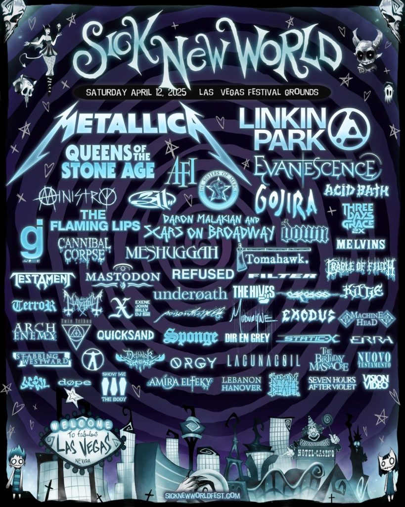 A edição de 2025 do festival Sick New World, originalmente agendado para decorrer no dia 12 de Abril do próximo ano, nos Las Vegas Festival Grounds, foi cancelado devido a “circunstâncias imprevistas”, diz um comunicado divulgado os organizadores do evento ontem sexta-feira, 29 de Novembro, ao final do dia. O festival, que contaria com um alinhamento liderado pelos METALLICA, LINKIN PARK e QUEENS OF THE STONE AGE torna-se assim uma das grandes perdas no calendário de festivais de música alternativa e pesada para o próximo ano.