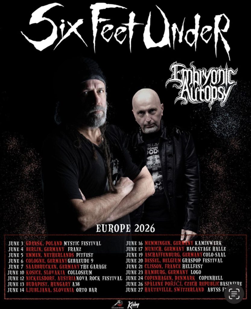 Os norte-americanos SIX FEET UNDER confirmaram uma digressão europeia para Junho, integrando a agenda de Primavera/Verão de 2026 e reforçando a ideia de que o grupo liderado por Chris Barnes vai entrar numa nova fase de actividade depois de vários anos de presença intermitente fora dos Estados Unidos. A rota surge na sequência das notícias que relativas ao 15.º álbum de estúdio da banda, que já está finalizado e tem edição prevista para ainda este ano.