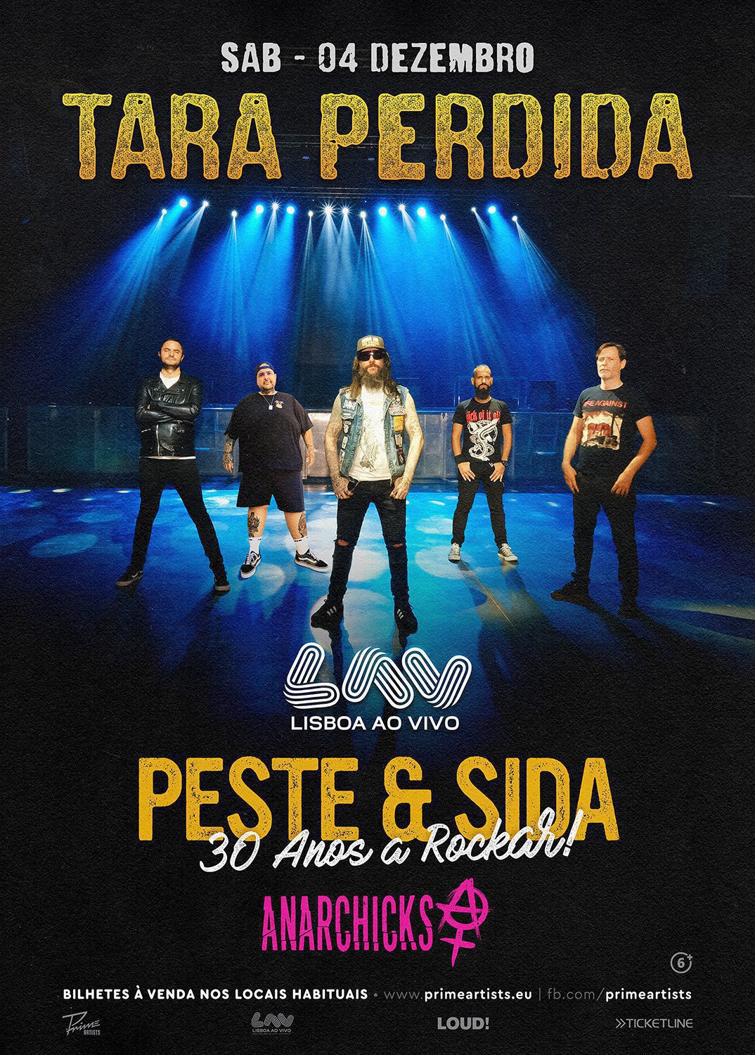 ACTUALIZAÇÃO: O concerto que junta os TARA PERDIDA, PESTE & SIDA e ANARCHICKS. anunciado para o próximo Sábado, 4 de Dezembro, foi adiado. “Em virtude das novas regras anunciadas pelo Governo, em vigor a partir de 1 de Dezembro 2021, o espectáculo de Tara Perdida + Peste&Sida + Anarchicks, agendado para o dia 4 de Dezembro no LAV Lisboa ao vivo, será adiado para data a definir. Logo que o alívio destas novas medidas o permitam, voltaremos a agendar o espectáculo“, pode ler-se num comunicado da Prime Artists. Os portadores de bilhete para o concerto poderão solicitar o reembolso do mesmo, no local de compra original, no prazo de 30 dias, a partir de dia 30 de Novembro de 2021.