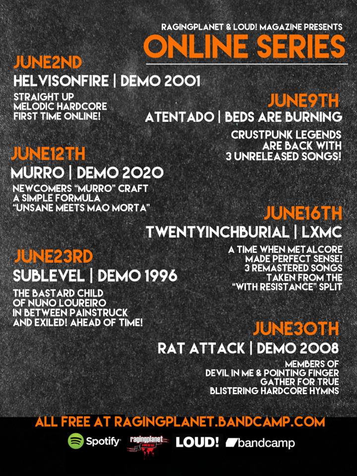 A RAGING PLANET, em parceria com a LOUD!, acaba de anunciar uma nova iniciativa intitulada ONLINE SERIES que, durante o mês de Junho, sempre às terças-feira e às 21:00, vai dar-vos música de graça através da edição — exclusivamente digital, via Bandcamp da Raging Planet — de um total de seis gravações de bandas nacionais. À excepção dos MURRO, que são a mais recente aposta do selo nacional e ainda não lançaram música, a campanha reúne edições que foram “esquecidas” pelo grande público ou que, até agora, se mantiveram inéditas e fechadas a sete chaves nos cofres da editora lisboeta. Da lista constam a «Demo 2001» dos HELVISONFIRE, o single «Beds Are Burning» dos ATENTADO, a «Demo 2020» dos MURRO, o EP «LXMC» dos TWENTYINCHBURIAL, a «Demo 1996» dos SUBLEVEL e, para terminar, a «Demo 20108», dos RAT ATTACK. Em baixo já podes consultar o calendário completo da ONLINE SERIES.