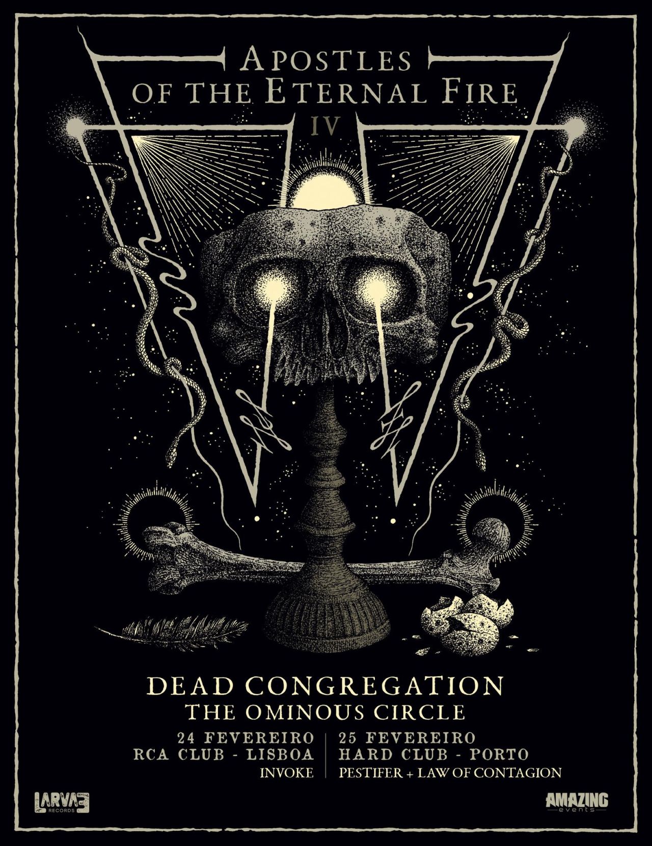 É já este fim-de-semana que o Apostles Of The Eternal Fire vai estar de regresso para a sua quarta edição. Nos dias 24 e 25 de Fevereiro, os nacionais INVOKE, PESTIFER, LAW OF CONTAGION e THE OMINOUS CIRCLE vão juntar-se às lendas do death metal DEAD CONGREGATION para duas noites de negritude sufocante a decorrer no RCA Club e no Metalpoint, em Lisboa e no Porto, respectivamente. Considerados já uma das bandas incontornáveis no que toca ao death metal no contingente nacional da música mais extreme, os THE OMINOUS CIRCLE conquistaram um número muito significativo de admiradores, a nível nacional e a nível internacional, com o demolidor LP de estreia «Appaling Ascension», de 2017. Após um longo período de silêncio, os músicos nortenhos voltaram ao activo já este ano com duas demolidoras actuações em festivais e, agora, voltam a servir a sua abordagem enigmática e avassaladora em dose-dupla. Não menos corrosivos e sufocantes, os DEAD CONGREGATION são uma das mais veneradas propostas do actual revivalismo OSDM e, oriundos das ilhas gregas, trazem na bagagem os muito aplaudidos álbuns «Graves Of The Archangels» e «Promulgation Of The Fall». O mais recente lançamento da banda foi o EP «Sombre Doom», editado a 22 de Outubro de 2016 pela Martyrdoom Productions. Os bilhetes para os espetáculos custam 25€ e ainda estão à venda nos locais habituais.
