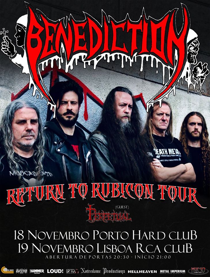 Trinta anos depois a edição do seu álbum de estreia, os BENEDICTION acabam de anunciar mais um regresso a Portugal. Divulgada pela banda como Return To Rubicon Tour, esta digressão contará com cinco datas ibéricas, sendo a primeira no Hard Club, Porto, a 18 de Novembro. Segue-se Lisboa, no dia seguinte, no RCA Club, rumando depois o quinteto para território espanhol. Tendo visitado o nosso país por diversas vezes, a primeira para promoverem o terceiro álbum, «Transcend The Rubicon», em 9193, o grupo tem estado afastado dos estúdios desde 2008, sabendo-se ter estado em 2019 a preparar um novo disco, que seria o primeiro em onze anos. Já depois da última aparição do grupo num concerto de boa memória no SWR de Barroselas, que pode ser visto no player em cima, o colectivo voltou a receber Dave Ingram como vocalista, criando expectativas em muitos fãs, pois este foi o seu frontman mais icónico, tendo permanecido no grupo durante quase toda a década de 90. Ingram entrou para os BENEDICTION substituindo Mark “Barney” Greenway que saiu da banda para se centrar nos NAPALM DEATH, onde ainda hoje permanece. Apesar das passagens pelos BOLT THROWER, DOWNLORD e ECHELON, entre outros grupos, Dave esteve sempre ligado aos BENEDICTION, com quem gravou quatro dos sete trabalhos da banda. A formação actual da banda fica completa com a eterna dupla de guitarristas formada por Darren Brookes e Peter Rewinsky, além dos recém-chegados Dan Bate, no baixo desde 2018, e Gio Durst, na bateria desde o ano passado. As primeiras partes das actuações dos britânicos em solo nacional será assegurada pelos espanhóis PERPETUAL, a que se juntam duas bandas portuguesas a confirmar.