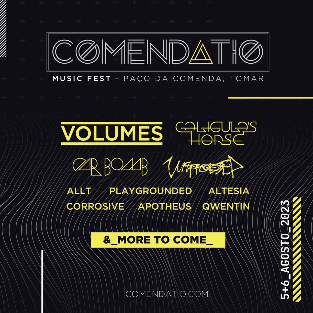 ste ano, o COMENDATIO MUSIC FEST, evento que tem vindo a transformar-se paulatinamente, no ponto de paragem obrigatória em solo nacional para quem aprecia e segue as tendências mais modernas e progressivas da música mais pesada, regressa uma vez mais ao Paço da Comenda, em Tomar, nos dias 5 e 6 de Agosto. Depois de uma primeira ronda de confirmação, a organização evento adicionou mais quatro nomes ao cartaz da edição deste ano: os muitos aplaudidos suecos ALLT, os exímios PLAYGROUNDED, formação que inclui músicos holandeses e também gregos, e ainda os nacionais APOTHEUS e QWENTIN. Desta segunda leva de contratações, o destaque vai obviamente para os ALLT, banda de metalcore progressivo sediada em Karlskoga, na Suécia, e formada em 2020. Com seu som sombrio e emotivo, estes jovens músicos combinam riffs afinados com melodias orelhudas e arranjos orquestrais, numa fusão de elementos díspares bem patente em «The Seed Of Self-Destruction», que foi editado em Abril de 2022. Recorde-se que estes nomes se juntam ao previamente assegurados VOLUMES, CALIGULA’S HORSE CARBOMB, UNPROCESSED, ALTESIA e CORROSIVE, com o anúncio de mais nomes a ficar prometido para os próximos tempos. Os bilhetes para o evento já estão à venda aqui.