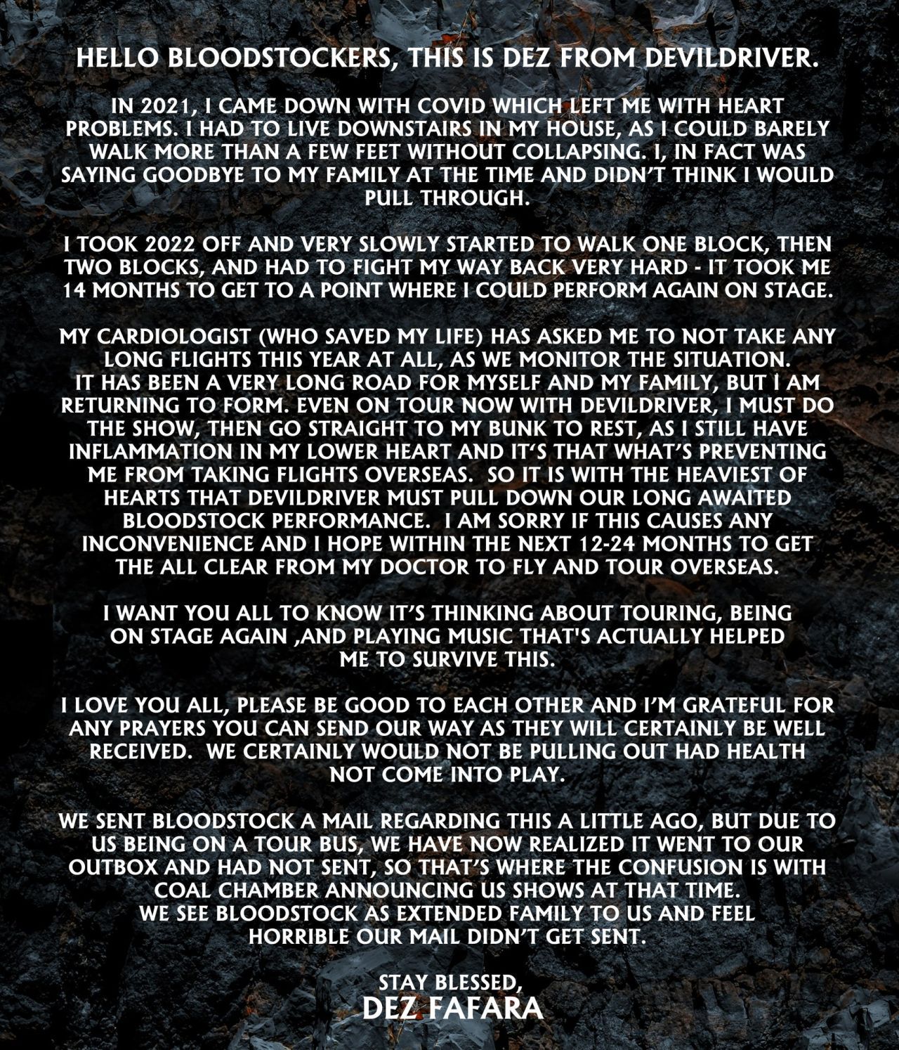 Os norte-americanos DEVILDRIVER cancelaram a sua participação no festival britânico Bloodstock Open Air devido a problemas de saúde relacionados com a COVID-19 por parte do vocalista DEZ FAFARA. O músico explicou a decisão de não voar para a Europa depois de ter sido anunciado que a sua outra banda, os COAL CHAMBER, vão andar em tour ao lado dos MUDVAYNE durante o Verão mas, alegadamente, este cancelamento não tem nada a ver com isso. “Em 2021, apanhei COVID-19 e fiquei com problemas cardíacos“, pode ler-se num comunicado. “Tive de mudar-me para o andar de baixo da minha casa, porque mal conseguia andar mais que alguns metros sem desmaiar. Na verdade, cheguei a despedir-me da minha família no tempo e não pensei que fosse sobreviver. Tirei o ano de 2022 de folga e, lentamente, comecei a andar um quarteirão, depois dois quarteirões, e tive que lutar muito para voltar à normalidade — demorei 14 meses para chegar a um ponto em que pudesse apresentar-me novamente no palco. O meu cardiologista (que me salvou a vida) pediu-me para não fazer voos longos este ano enquanto monitorizamos a minha situação.” Podes ver o comunicado do músico na íntegra em baixo.