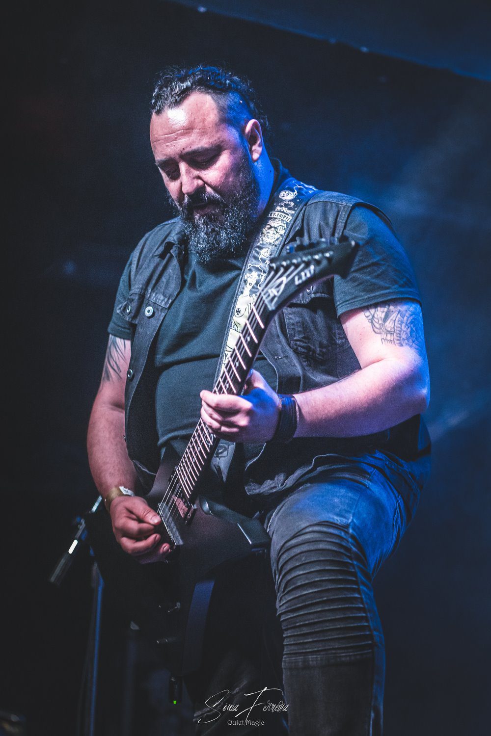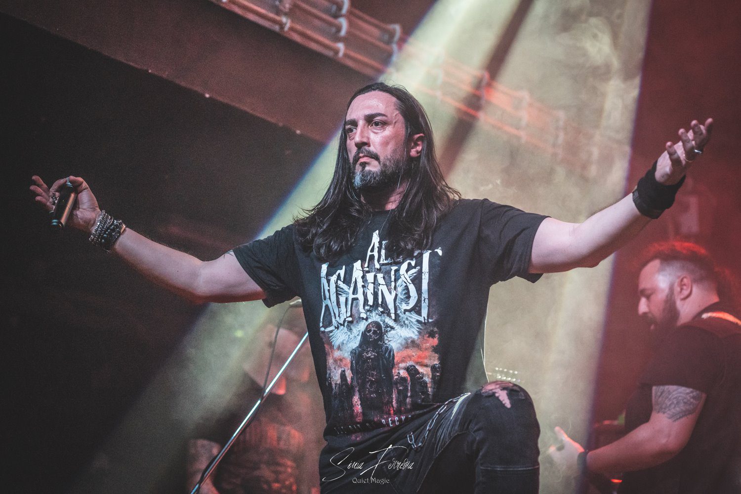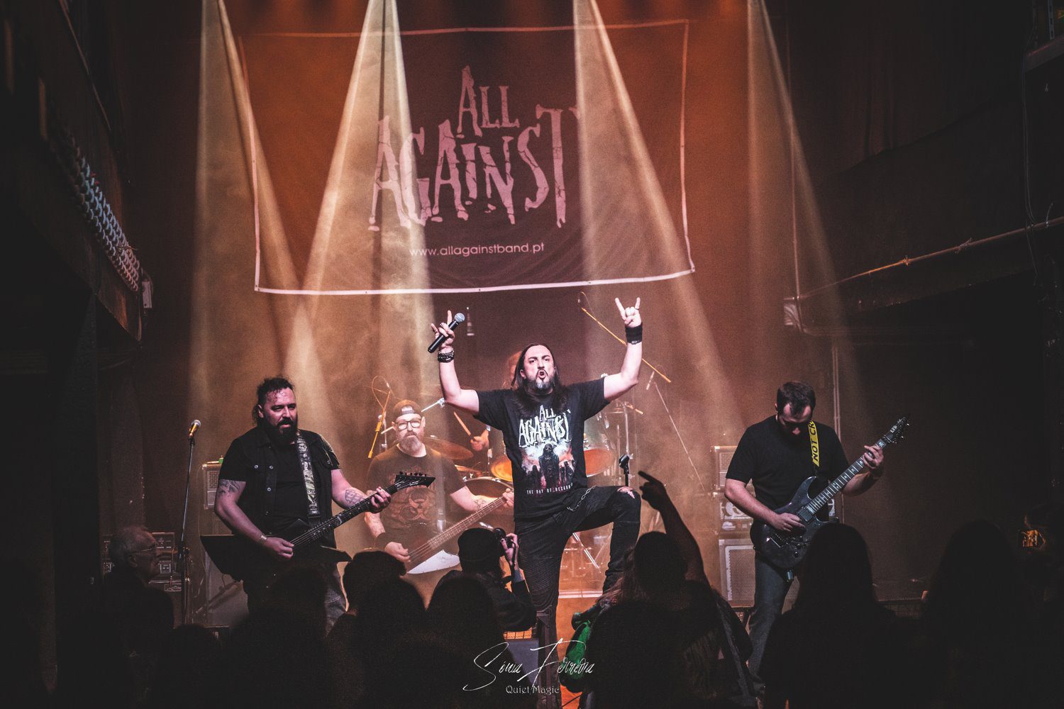 Num ponto diferente da carreira, mas afirmando-se também uma banda que tem tido um interessante percurso na cena nacional, subiram ao palco os ALL AGAINST. Mais uma prova da persistência e perseverança necessárias para quem quer fazer música pesada neste jardim da Europa à beira-mar plantado. Quando estavam a trabalhar na composição de «The Day Of Reckoning», ficaram sem vocalista, num golpe que poderia ter sido fatal. Sem desistir, encontraram o sucessor à altura na figura de Henrique Martins, que lhes permitiu encontrarem mais um ponto alto na sua carreira. Como seria esperado, o foco foi mesmo o já mencionado álbum de originais lançado precisamente naquele dia pela Amazing Records que foi tocado na íntegra, embora o início tenha sido mesmo com um regresso ao passado e a junção de «Weapons Of Mass Distraction (WMD)» com «Medusa». Este novo capítulo vê a banda apostada em continuar a evoluir e a tornar o seu som mais trabalhado, mas sem nunca perder de vista as letras de consciência social assim como a abordagem mais moderna ao thrash. Apesar da intensidade da música em cima do palco, e das instigações por parte de Henrique Martins, o público estava algo tímido, mas a recepção foi bem positiva.