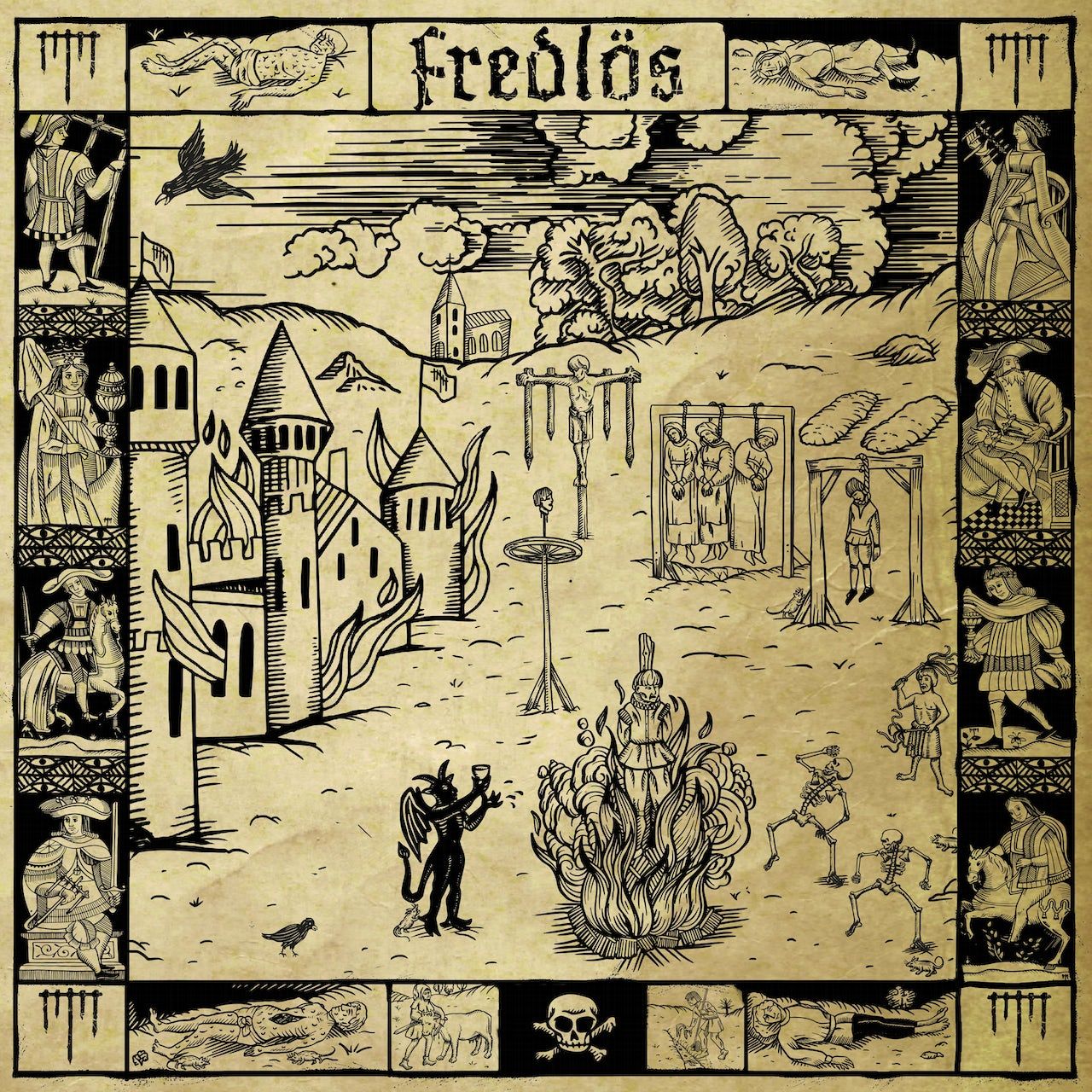 FREDLÖS, a nova banda de Estocolmo, na Suécia, que conta na sua formação com Alex Hellid, o guitarrista dos ENTOMBED, lançou um vídeo-clip oficial para o seu mais recente single, «Otto», que já pode ser visto em cima. A faixa faz parte do alinhamento do álbum de estreia homónimo do grupo, que vai ser editado no dia 10 de Fevereiro através de uma colaboração entre os selos Threeman Recordings, Fredlös Produktion e Sound Pollution. Segundo comunicado de imprensa, este colectivo nasceu durante a Primavera de 2021 em Norrtälje, a nordeste de Estocolmo, “erguendo-se das cinzas das aventuras musicais anteriores” dos seus elementos. “Unidos por um profundo sentido das suas raízes históricas e por um amor pelos sons mais obscuros“, os músicos “criam uma paisagem verdadeiramente épica, misturando guitarras pesadas com instrumentos mais tradicionais e uma necessidade de relacionar a história verdadeira com os factos. O resultado é um som melódico mas sem esforço, onde o ouvinte pode sobreviver e prosperar no escuro“, pode ler-se na nota de imprensa. «Fredlös» contém nove canções pesadas e intensas. Liricamente, o álbum é uma viagem através do final da Idade Média, recordando acontecimentos históricos a partir da perspectiva do povo comum e, no que toca à música, desafia qualquer descrição, tecendo temas que misturam metal, rock, folk e música tradicional. Podes conferir a capa e o alinhamento completo do disco em baixo.