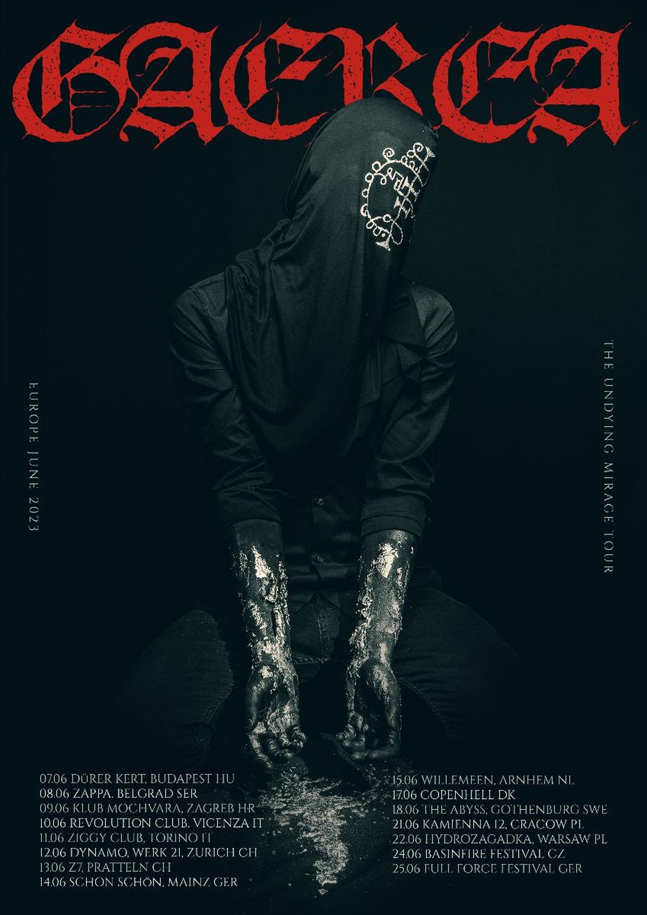 Depois de, no passado fim-de-semana terem feito aqueles que foram os seus únicos dois concerto em Portugal deste ano [podes ler a reportagem do espectáculo em Lisboa aqui], os nacionais GAEREA acabam de adicionar uma série de datas à sua próxima digressão europeia, que os vai levar a várias salas espalhadas pelo Velho Continente e também a diversos festivais de Verão, onde vão mostrar pela primeira vez o material do seu mais recente álbum de estúdio, com o título «Mirage», que foi editado a 23 de Setembro de 2022 através da Season Of Mist. “A Undying Mirage Tour vai marchar mais uma vez sobre a Europa durante este Verão!“, diz a banda num breve comunicado. “No próximo mês de Junho, a Vortex Society chegará a vários novos países e a uma selecção de festivais massivos. Aguardam-nos 15 noites alucinantes de paisagens sonoras de terror catártico. Juntem-se a nós“. Podes conferir as datas agora anunciadas em baixo. Já este mês, nos dias 8 e 30 de Abril, respectivamente, os GAEREA vão tocar no norueguês INFERNO FESTIVAL e no neerlandês BLOODSHED FEST.