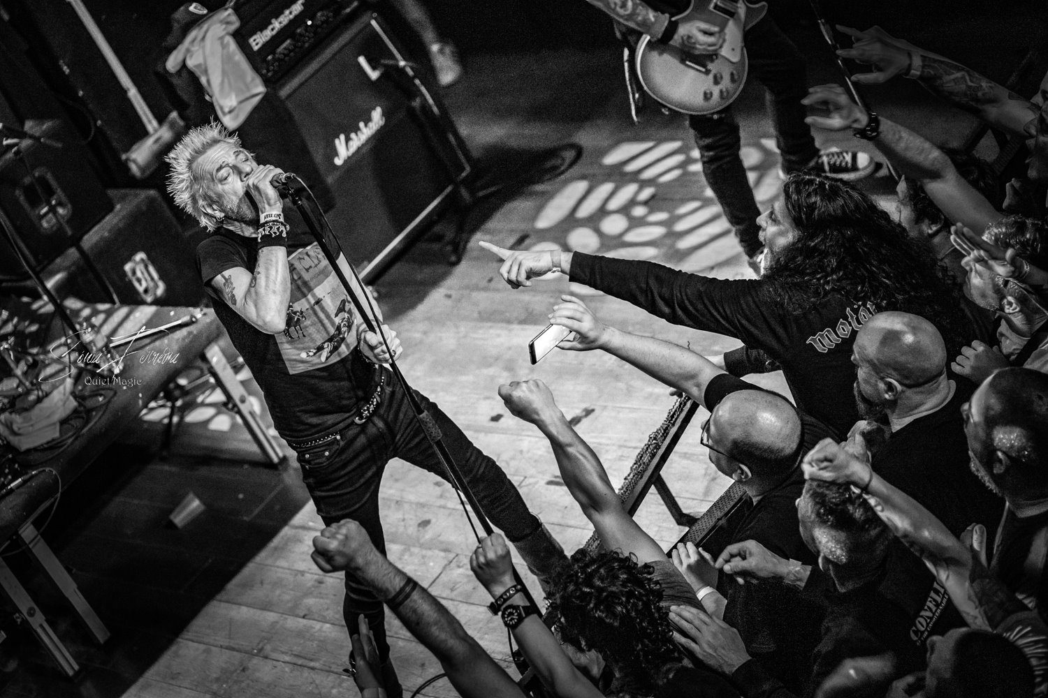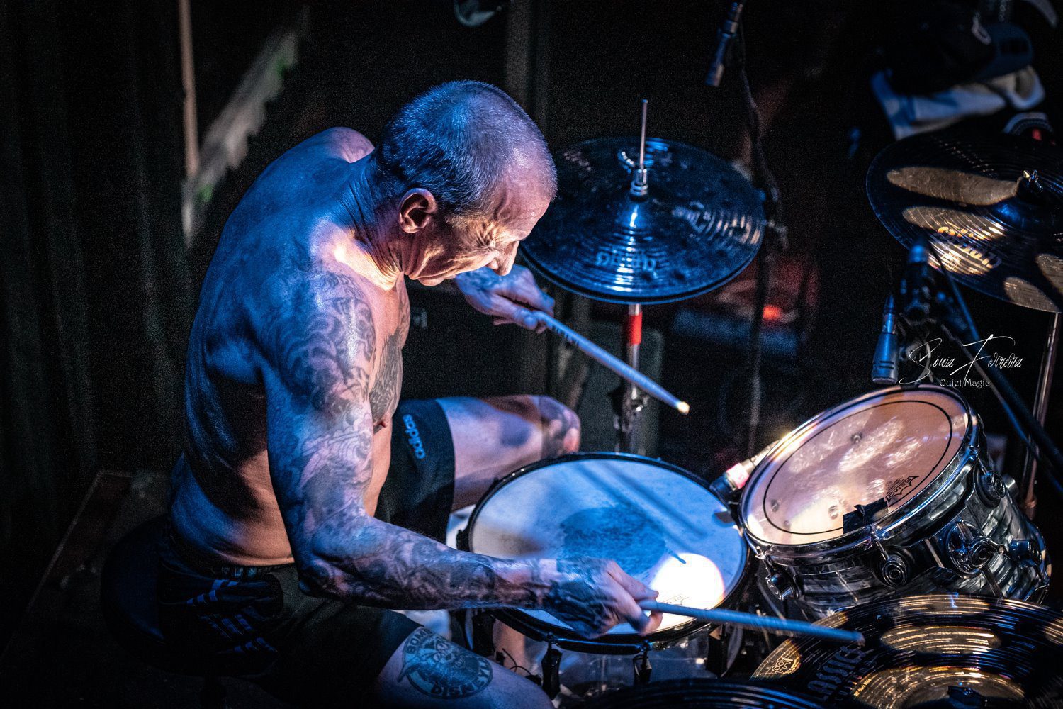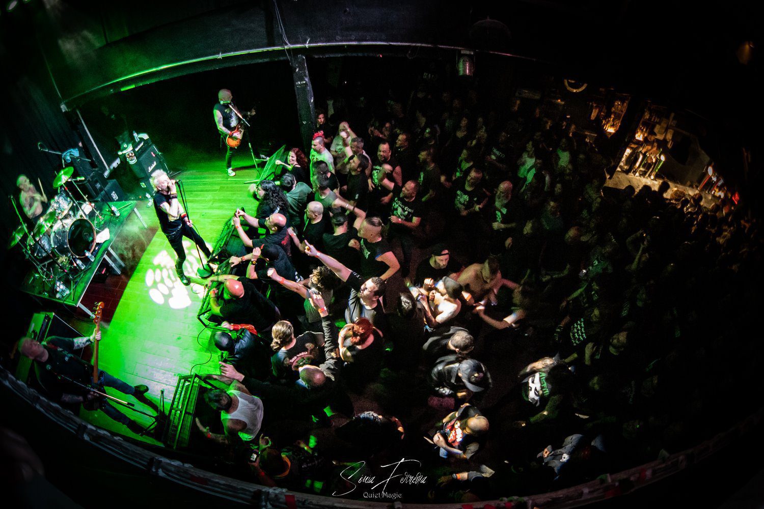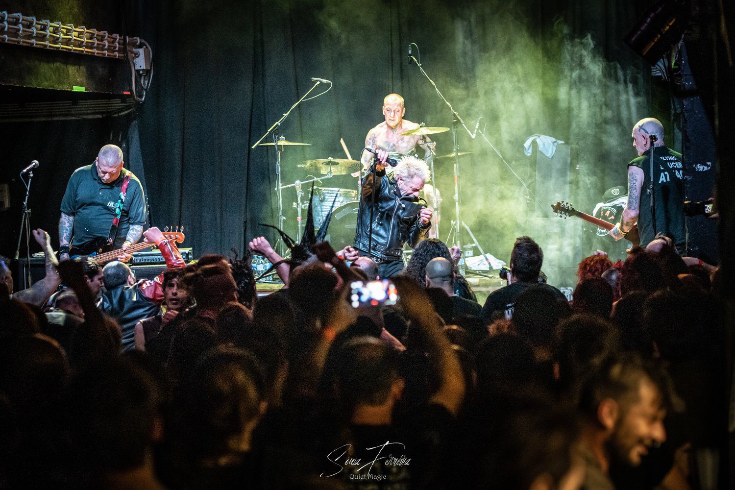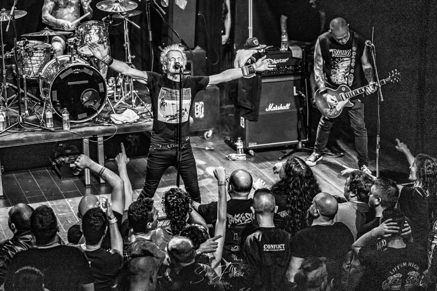 O entusiasmo, e a aura que pairava no ar a que nos referimos atrás, começava agora a transformar-se numa nuvem já mais densa e pronta a explodir. E foi isso que aconteceu com o primeiro tema dos GBH, «Time Bomb», retirado do já citado «City Baby Attacked By Rats», que foi tocado quase na íntegra. Apesar de ser o álbum mais acarinhado pelos fãs, toda a carreira da banda britânica está repleta de clássicos, sendo uma boa prova disso a forma entusiasta como «Momentum» e «Generals» foram recebidos. A comunicação limitou-se praticamente ao anúncio das músicas antes de serem tocadas e um ocasional “estão todos bem?” por parte de Colin Abrahall, que revelou uma invejável forma física — aliás como toda a banda — e não parou um momento. Quem também não parou por um momento que fosse foi o público em frente ao palco, com aquelas batalhas campais que são sempre impressionantes de ver e que colocam um sorriso no rosto de quem as a aprecia mais de longe. Para o final, ficaram reservados os dois temas-título dos já mencionados clássicos do street punk antes de uma espécie de encore (a banda não chegou a sair do palco mas houve uma pausa maior que o costume) para tocarem «Liquid Paradise (The Epic)» e uma versão da «Bomber», das lendas Motörhead, que colocaram um ponto final numa noite memorável, que causou impacto positivo não só nos fãs mais ferverosos mas também na própria banda que anteriormente já tinha agradecido à Hell Xis e às bandas que tocaram antes deles. A avaliar pelos sorrisos nos rostos, a gratidão maior era mesmo de todos os fãs.