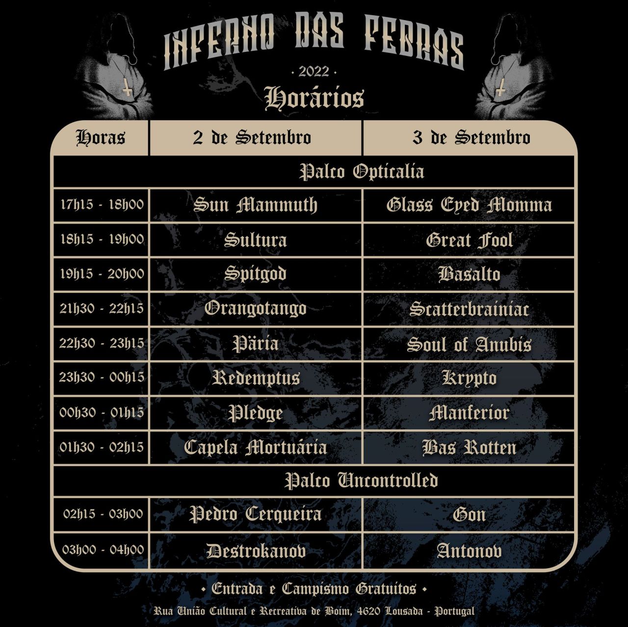 A entrada é gratuita, o campismo também e tudo se passa a 2 e 3 de Setembro em na localidade de Boim, Lousada, perto do Porto. O mote, esse, é relativamente simples: “febras, vinho, cerveja e muito rock’n’roll”. O nome do festival é INFERNO DAS FEBRAS, pois claro. Iniciado em 2017 e apenas com paragem obrigatória forçada pela pandemia e pelas restrições impostas, o evento surgiu entre um convivo de amigos onde as febras não poderiam carecer e as bandas dos envolvidos tocariam. De febras, punk e rock’n’roll nasceu então este “Inferno”. No entanto, a brincadeira acabou por “sair cara” e, gradualmente, acabaria mesmo por transformar-se em algo sério devido à adesão crescente do público em geral. Este ano, o cartaz surge recheado de nomes alternativos e emergentes, dentro do rock sujo e do hardcore e post rock nacional. KRYPTO, REDEMPTUS, BAS ROTTEN, PLEDGE, SOUL OF ANUBIS, MANFERIOR, SCATTERBRAINIAC, CAPELA MORTUÁRIA, BASALTO, PARIA, SPITGOD, ORANGOTANGO, GREAT FOOL, SUN MAMMUTH, GLASS EYED MOMMA e SULTURA. Depois, em jeito de embalo para a noite, tocam quatro DJs, dois na sexta-feira (Pedro Cerqueira e Destrokanov) e dois no Sábado (Gon e Antonov), que também prometem muito rock. Em suma, o evento, que tem uma vez mais assinatura da LSD Bookings, promete muita música boa. Abrindo portas às 16:00, o evento prolonga-se pela noite dentro e os horários – que podes consultar em baixo – são, por si só, sinal da festa que se vai fazer sentir por aquelas paragens.