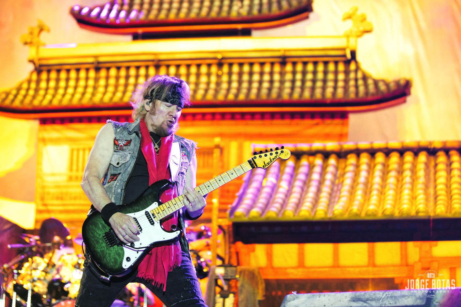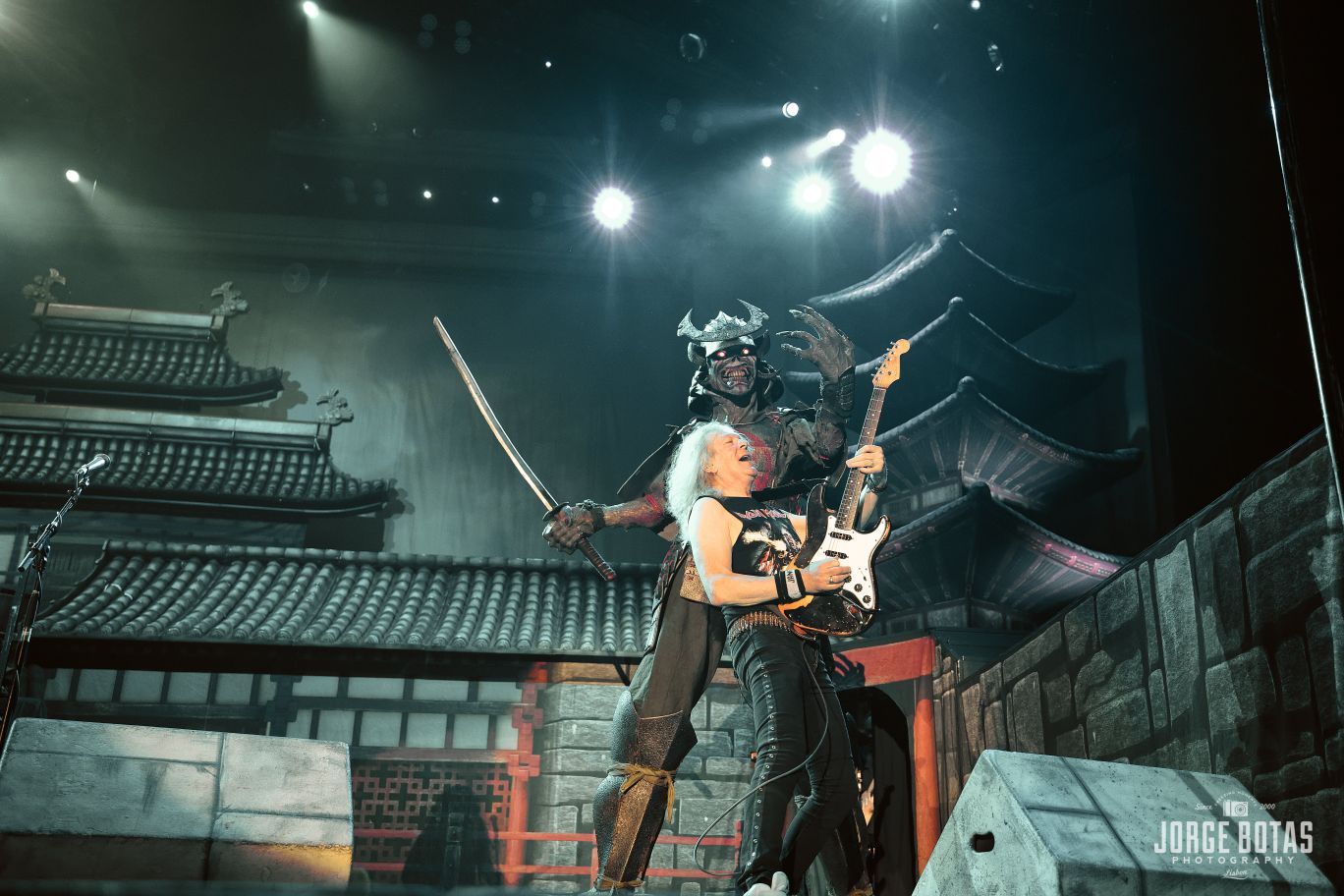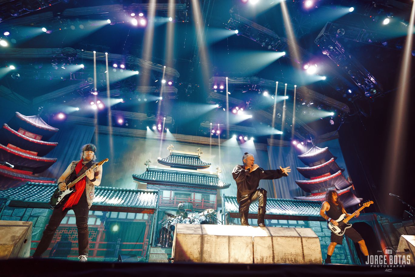 Como já vem sendo habitual, as luzes do recinto apagaram-se assim que começaram os primeiros acordes do clássico «Doctor, Doctor», dos UFO, e percebeu-se rapidamente que o público ia estar quentinho a noite toda. De realçar que havia pessoas vindas de toda a parte nas primeiras filas, incluindo portugueses, brasileiros, espanhóis e noruegueses, entre muitas outras nacionalidades. Com o palco montado a fazer lembrar o Japão, ou não fosse esse o tema do mais recente disco, «Senjutsu», foi ao som desse tema-título que os IRON MAIDEN subiram ao palco, com a aparição do Eddie em versão Samurai, sob um jogo de luzes impressionante e um som absolutamente cristalino e definido, algo raro de ouvir em estádios. Seguiu-se «Stratego» e «The Writing On The Wall» para terminar a trilogia de temas do mais recente disco. Escusado será dizer que, para quem vai assistir aos concertos desta digressão, o alinhamento não mudará. Por isso, em Lisboa, esperem algo idêntico. «Revelations» deu início à sequência de temas com base na religião, seguindo-se «Blood Brothers» e o épico «The Sign Of The Cross», com Bruce Dickinson a carregar uma cruz iluminada e a correr de um lado para o outro com ela. Este continua a ser um dos muitos momentos altos do concerto, um daqueles temas que arrepia sempre que se ouve ao vivo. Em «The Flight Of Icarus», Bruce transforma-se num pirómano e passa o tempo a brincar (e a cantar) com o lança-chamas, até à queda final de Ícaro no fundo do palco.
