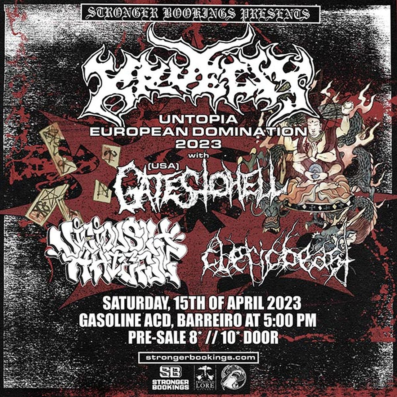 Muito badalados no underground, os japoneses KRUELTY vão estrear-se em Portugal com uma data única, agendada já para o próximo Sábado, dia 15 de Abril, no Gasoline ACD , no Barreiro. Oriundos de Tóquio, os músicos contam com dois LPs e alguns singles e splits no fundo de catálogo, e têm gozado de bastante atenção nos últimos tempos. Muito graças a um segundo álbum, intitulado «Untopia», que trazem agora na bagagem e que se afirmou com um potente petardo de extremismo sonoro, com um pé no hardcore e outro no death metal. A data nacional surge inserida na Untopia European Domination 2023, que sucede a uma rota muito bem recebida nos Estados Unidos em 2022. Neste périplo pelo velho continente, vêm acompanhados por outra banda que também nunca tocou por cá, aumentando ainda um pouco mais a curiosidade em relação ao que se vai passar na Margem Sul do Tejo. Os norte-americanos GATES TO HELL também têm dado bastante que falar neste circuito e vão apresentar ao público nacional o seu álbum de estreia, que foi editado em 2022. Na abertura, actuam os nacionais VICIOUSLY HATEFUL e clericbeast.