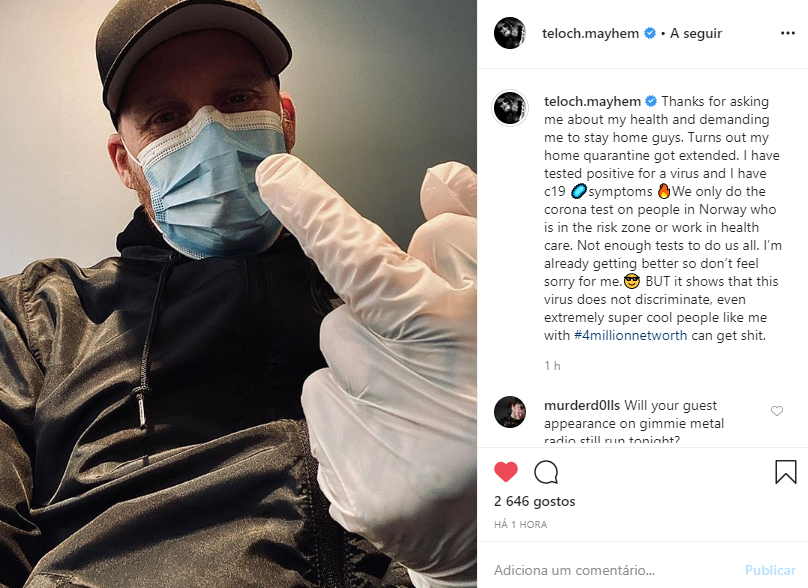 Depois de Chuck Billy e Steve DiGiorgio, ambos dos TESTAMENT, e Gary Holt, dos EXODUS e SLAYER, agora há um nome a juntar à lista de músicos potencialmente contaminados com o Coronavírus. Apesar de não saber a 100% se contraiu a doença, hoje, terça-feira, dia 7 de Abril, Teloch, o guitarrista dos noruegueses MAYHEM, usou a sua conta oficial no Instagram para fazer um update em relação ao seu estado de saúde e confirmou ter testado positivo para um vírus — que pode, ou não, ser a COVID-19. “Obrigado por perguntarem sobre minha saúde e exigirem que fique em casa, pessoal“, diz o músico no post que pode ser visto em baixo. “Acontece que a minha quarentena foi prolongada. Testei positivo para um vírus e tenho sintomas de c19. Na Noruega só fazemos o teste do coronavírus a pessoas que estão na zona de risco ou trabalham na área de saúde. Não há testes suficientes para fazer a toda a gente. Já estou a melhorar, por isso não sintam pena de mim. No entanto, isto mostra que este vírus não discrimina, mesmo pessoas extremamente super fixes como eu podem apanhar uma merda destas.” «Daemon», o mais recente álbum de estúdio dos MAYHEM, foi lançado no dia 25 de Outubro de 2019 via Century Media.