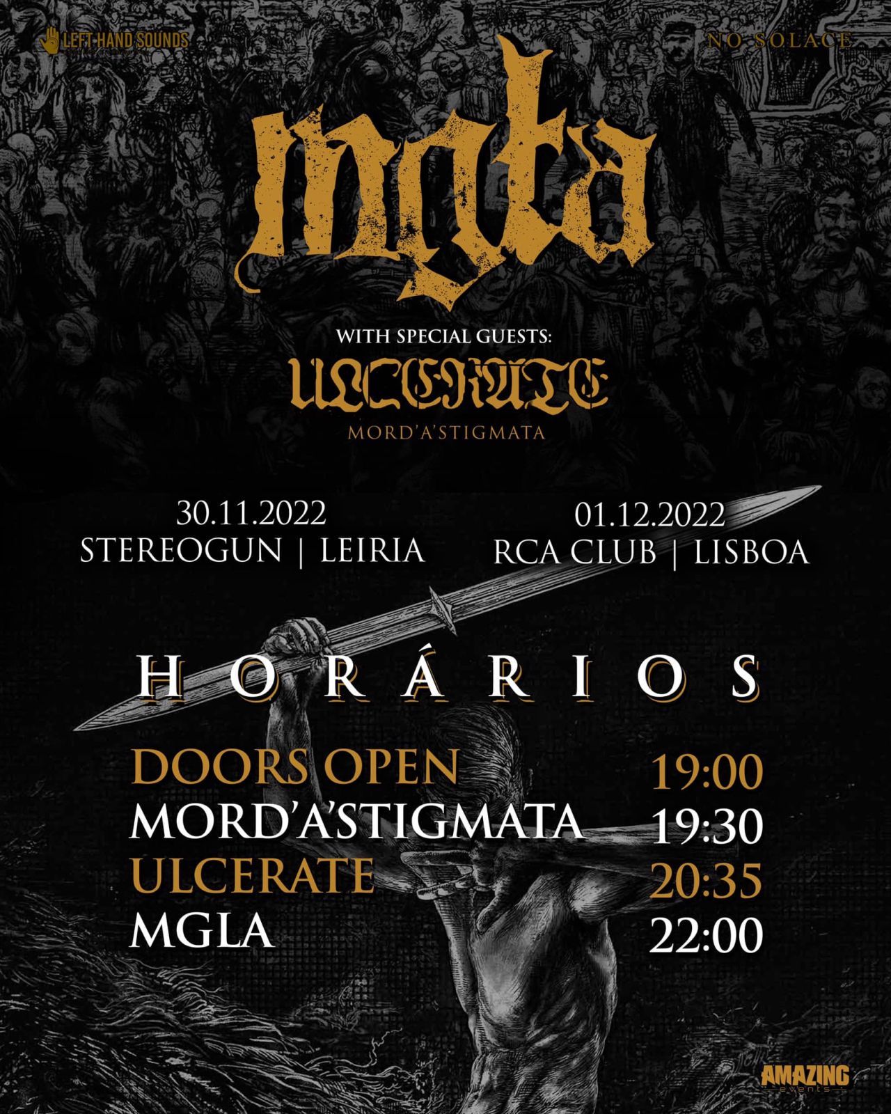 Depois de se terem estreado em solo nacional como suporte aos conterrâneos BEHEMOTH, os MGŁA fizeram os primeiros concertos em nome próprio em Portugal em 2019 e, já este ano, voltaram para assinar uma actuação arrebatadora no SWR FEAST, em Barroselas. Agora, regressam para uma dupla-dupla que, na sequência do concrto no Sterreogun, em Leiria, aterra hoje, 1 de Dezembro, em Lisboa, para uma actuação no RCA Club. A primeira parte do espectáculo será assegurada pelos conterrâneos MORD A’STIGMATA e pelos neozelandeses ULCERATE, ambos com álbuns novos para promover na bagagem. Desde que se mostraram ao mundo há pouco mais de uma década, os polacos MGŁA têm mantido um fluxo constante de edições que culminou, em 2019, com o colossal «Age Of Excuse», um registo que consegue ser, ao mesmo tempo, frio e envolvente, e provar que há projectos capazes de empurrarem os limites do que é possível fazer dentro de um género, o black metal, em que parece que já foi tudo inventado. Em baixo podes ver os horários das actuações e o alinhamento provável dos cabeças-de-cartaz para o espectáculo de hoje à noite.