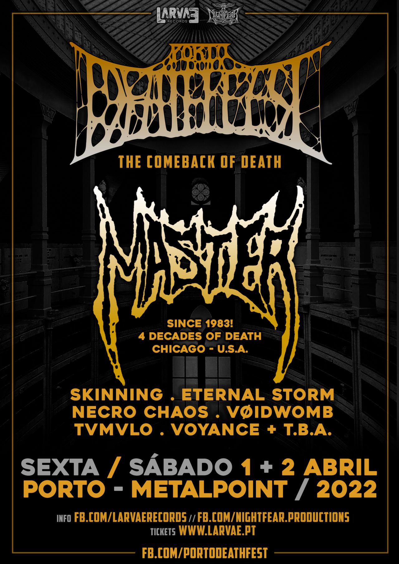 Será como recomeçar de novo, apostar em nomes que estejam perto e assegurem a efectividade dos eventos sem quaisquer sobressaltos. É um passo curto, mas ousado, no que pode ser o primeiro festival portuense do ano. Trata-se do PORTO DEATHFEST, que decorre entre 1 e 2 de Abril no Metalpoint, localizado no C.C. Stop. Se, no passado, houve vários nomes de peso, com o evento a chegar a estar prometido para vários finais de semana, desta feita serão dois dias em que se espera apenas um par de nomes que necessitem de atravessar fronteiras, os espanhóis ETERNAL STORM e MASTER, naturais cabeças de cartaz num desejado regresso ao nosso país. Renovada em 2019, a lendária banda liderada por Paul Speckmann já andava a ser anunciada neste par de anos e, finalmente, parece que se vai mesmo concretizar o regresso ao nosso país. Quase a completar quarenta anos de existência, embora com uns hiatos pelo meio, os MASTER têm estado bastante activos. Além das reedições, que surgem numa zona cinza entre o oficial e o alternativo, são oito os títulos lançados com a actual formação, incluindo um álbum de estúdio e outro gravado ao vivo na Grécia. Numa organização mútua da Larvae Records e Nightfear Productions, o festival vai apresentar ainda uma série de nomes portugueses, que são apostas futuras para o death nacional, como é o caso dos VOYANCE, NECRO CHAOS, VOIWOMB ou TVMVLO, a que se juntam também os SKINNING, cujo último disco ainda carece de apresentação apropriada. Os bilhetes estarão à venda nos locais habituais, incluindo a portuense Bunker Store e custam 20 euros para os dois dias, sendo de quinze euros o custo do bilhete diário.