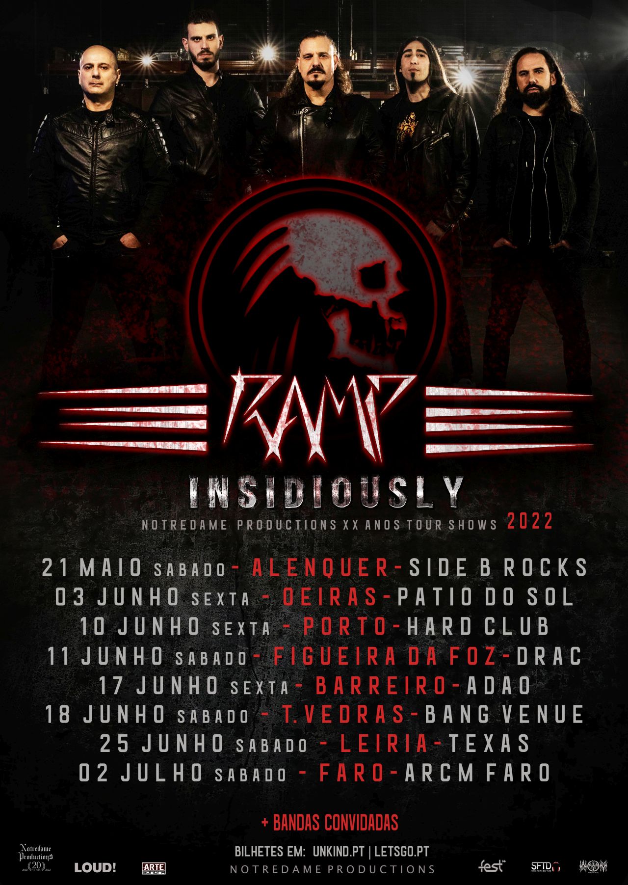Foram treze anos desde o último trabalho de estúdio. Treze anos difíceis, mas em que os RAMP nunca pararam realmente, dando concertos aqui e ali, fazendo reedições. Agora, com «Insidiously», quinto longa-duração do grupo renovado, na bagagem, prepararam-se para correr o país de norte a sul. Bastou, de resto, um novo disco para o quinteto voltar à estrada e, depois de três datas em Abril, acabam de anunciar uma tournée nacional. Esta digressão é o resultado de uma cooperação com a promotora Notredame Productions, que celebra vinte anos de atividade, e faz chegar o espetáculo dos RAMP a oito salas em cidades diferentes de norte a sul de Portugal. O grupo apresenta-se com a nova formação composta por Rui Duarte na voz, Ricardo Mendonça e Pedro Mendes nas guitarras, Apache no baixo e João Gonçalves na bateria. “Este foi o disco de RAMP com o processo de concepção mais violento até hoje”, diz o vocalista Rui Duarte, a propósito de «Insidiously», editado pela Rastilho. “Com os seus elementos envolvidos em permanentes crises pessoais, com mudanças de line up e estruturas de trabalho, com a pandemia, tudo pareceu ser uma verdadeira prova de superação. Se ao longo destes anos aprendemos o verdadeiro sentido da palavra amizade, este foi, sem dúvida, um dos seus derradeiros testes. Mais do que um álbum, o «Insidiously» tornou-se numa prova de vida e de experiências. Uma luta que se foi desenrolando e evoluindo dentro de nós, contra nós e contra tudo o que passava à nossa volta.”