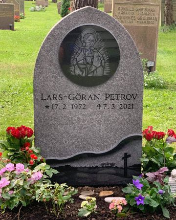 A imagem, inspirada na capa de um livro, pode iludir aqueles que passam rapidamente e julgam estar ali uma imagem da virgem Maria, quando na realidade ilustra Lúcifer, com a mão e dedos posicionados formando um par de cornos. O anúncio da lápide e sua colocação, foi feito por membros de FIRESPAWN, o seu último projecto antes de morrer. Petrov ingressou como vocalista principal neste super-grupo de death metal em que surgia ladeado por actuais e ex-membros dos NECROPHOBIC, UNLEASHED e DARK FUNERAL.