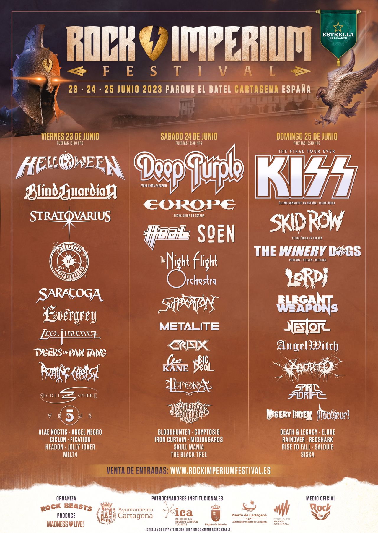 Com os bilhetes já disponíveis, o ROCK IMPERIUM FESTIVAL afirma-se como um evento que mistura vários estilos de metal, embora mais orientado para as sonoridades dos anos 80 e 90. O evento divide-se por três palcos, dois junto à muralha de Carlos III, no Parque de la Cuesta del Batel, e um terceiro palco, situado no porto da cidade, junto ao Auditorio El Batel.