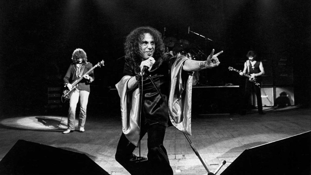 Em 1979, o cantor separa-se do grupo que o colocou no pelotão da frente e pensa em iniciar carreira a solo. A saída de Ozzy Osbourne, leva Tony Iommi a procurar um novo vocalista que encontra em Ronnie. Com ele, os BLACK SABBATH têm pela primeira na formação alguém com conhecimento formal de música. A banda ganha um novo compositor e, para marcar posição, Dio ensaia um gesto que se tornaria símbolo do metal, os devil horns. Como ele não se cansaria de afirmar em palco, o gesto significava, “longa vida ao rock’n’roll”, curiosamente o título do último dos três discos que gravaria com os RAINBOW. Com os BLACK SABBATH, asseguraria em «Heaven & Hell», de 1980, um dos melhores álbuns da banda, renovando-lhes o som, modernizando-o mesmo. Seguir-se-ia «Mob Rules», em 1981 e o primeiro álbum oficial ao vivo do grupo, «Live Evil», em 82. Desentendimentos na produção do disco levaram à separação e à carreira a solo.