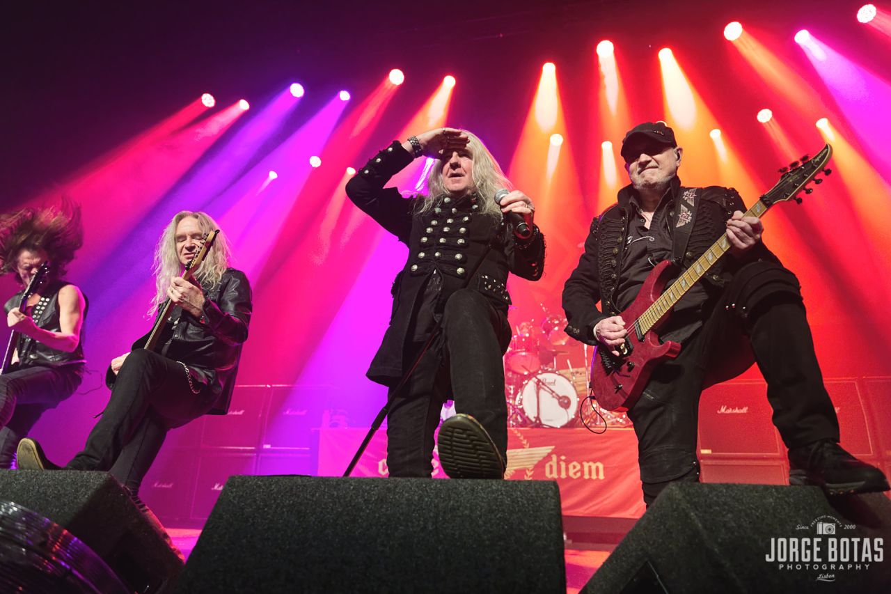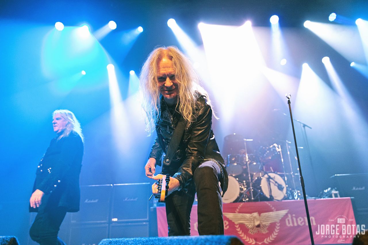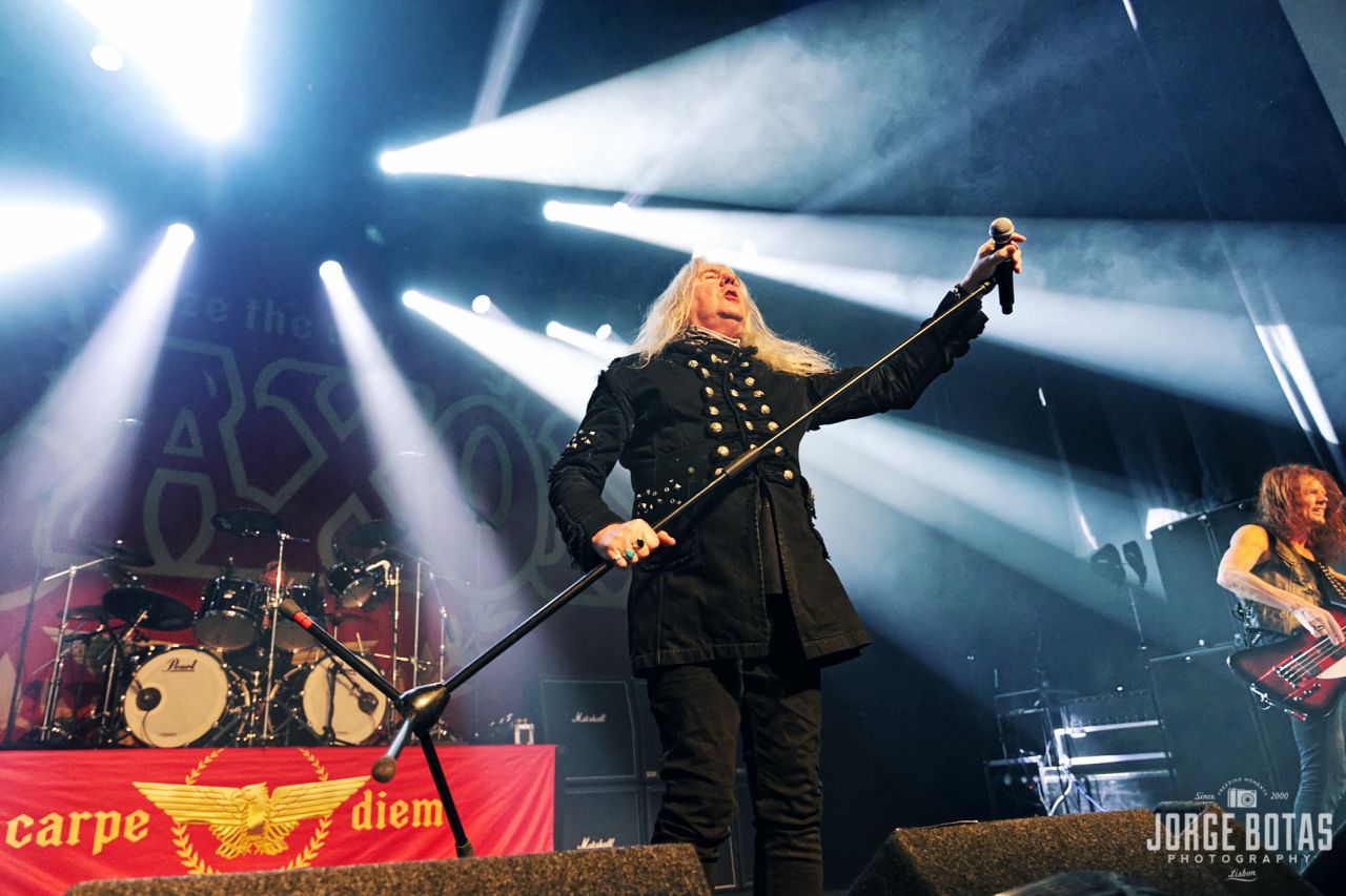 Às 21:00, os SAXON subiram ao palco e, logo que se ouviram os primeiros acordes do mais recente «Carpe Diem (Seize The Day)», percebeu-se que ia ser uma noite com o volume no máximo, mas sem distorção. Seguiu-se «Motorcycle Man», com direito a assobio e com um Biff Byford em excelente forma vocal. Aliás, não é difícil perceber que toda a banda está em grande forma, principalmente o baixista Nibbs, que continua possuído, a andar de um lado ao outro do palco, em constante headbanging. Com os veteranos britânicos ainda a promoverem o mais recente «Carpe Diem», foram alternando temas do novo disco com clássicos. Por exemplo, «Dallas 1PM» antecedeu «Heavy Metal Thunder»,que levou o público ao rubro. Com muitos casacos a serem atirados para cima do palco, Biff Byford e Doug Scarratt não se fizeram rogados em vesti-los para, depois, os assinarem e devolverem ao público. Com o disco «Sacrifice» a celebrar dez anos desde o lançamento original, a banda tocou o tema-título, que não estava previsto no alinhamento. Chegava então o momento para o público escolher uma de três canções: «Broken Heroes», «Crusader» ou «The Eagle Has Landed». A resposta foi ensurdecedor quando Byford mencionou «Crusader», por isso a escolha tornou-se mais que óbvia, sendo que a banda optou por tocar «Crusader» e «The Eagle Has Landed». Antes de «Power And The Glory», o vocalista dos Saxon ainda teve tempo para perguntar se era preciso tocarem mais alto e, perante a resposta afirmativa por parte da plateia, a primeira parte do concerto terminou, em alto e bom som, com «And The Bands Played On» e «Wheels of Steel».Para o encore, numa noite que já ia longa, ainda havia muito mais música pela frente. «The Pilgrimage», um dos melhores temas do mais recente disco, é daqueles que pode e deve continuar a fazer parte dos alinhamentos dos SAXON. «Strong Arm Of The Law», como seria de esperar, teve grande participação do público que enchia a sala em Dublin. «Solid Ball Of Rock» e «747 (Strangers In The Night)» antecederam as obrigatórios «Denim and Leather» e «Princess Of The Night», que levaram o público ao rubro e fecharam uma noite de duas horas de puro heavy metal, assinada por uma das melhores bandas de sempre da história do género.