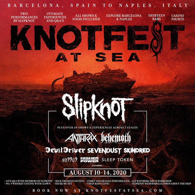 Já se passaram vários meses desde que os SLIPKNOT anunciaram que iam ser anfitriões do primeiro cruzeiro Knotfest At Sea, que vai partir da costa de Barcelona, mesmo aqui ao lado, em Espanha. A viagem prolonga-se por cinco dias, de 10 a 14 de Agosto de 2020, e conta com duas apresentações separadas dos SLIPKNOT. “Barcelona, um navio gigante e o mar. Nós, vocês. é algo que não vão querer perder“, diz Shawn “Clown” Crahan no vídeo de apresentação do evento, que pode ser visto no player em cima. Agora, os titãs de Iowa revelaram finalmente quem mais se juntará a eles. Além de confirmar. como já tinha sido prometido, uma série de actividades relacionadas à banda, estão confirmadas também as presenças dos ANTHRAX, BEHEMOTH, DEVILDRIVER, SEVENDUST, SKINDRED, Ho99o9, HIGHER POWER e SLEEP TOKEN, com mais nomes a serem anunciados em breve também. Recorde-se que, a 17 de Agosto, os SLIPKNOT actuam na Altice Arena, em Lisboa. A lista de coisas para fazer “com os Slipknot” pode ser consulta em baixo.