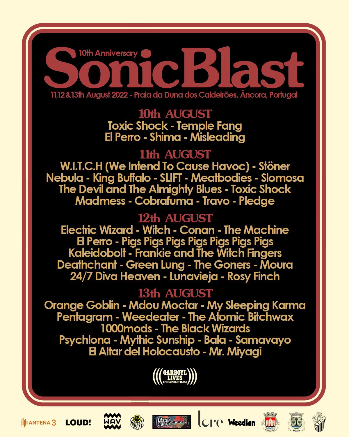 O SONICBLAST FEST está de regresso, realizando-se este ano nos dias 11, 12 e 13 de Agosto. Esta é já a 10.ª edição do evento, depois de um interregno de dois anos, num novo recinto, com novos palcos e novas bandas num cartaz bastante extenso com alguns dos maiores nomes do stoner e psych rock actual, tanto a nível nacional como internacional. Com o cartaz fechado e com os passes gerais quase a esgotar, a Garboyl Lives, entidade responsável pelo certame, anuncia agora o alinhamento diário para o festival deste ano. Os W.I.T.C.H., STÖNER e NEBULA encabeçam o primeiro dia de festividades, quanto os ELECTRIC WIZARD, WITCH e CONAN são os grandes destaques do dia 12 de Agosto. Por fim, os ORANGE GOBLIN, MDOU MOCTAR e MY SLEEPING KARMA são algumas das bandas que encerram o festival a 13 de Agosto. No dia da recepção aos festivaleiros e da festa de warm-up actuam os TOXIC SHOCK, TEMPLE FANG, EL PERRO, SHIMA e MISLEADING. Entretanto, importa referir também que os portugueses COBRAFUMA foram adicionados ao cartaz , enquanto os TIA CARRERA e WE HUNT BUFFALO foram obrigados a cancelar a sua presença no festival por motivos pessoais. A edição de 2022 do SONICBLAST acontece na Praia da Duna do Caldeirão, em Âncora, concelho de Caminha, distrito de Viana do Castelo. O passe geral para o evento está prestes a esgotar, mas de momento ainda se encontra disponível por 75€, sendo que os bilhetes diários estão a partir de agora disponíveis por 35€. A entrada na festa de warm-up é gratuita para portadores de passe geral.