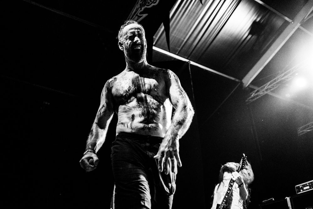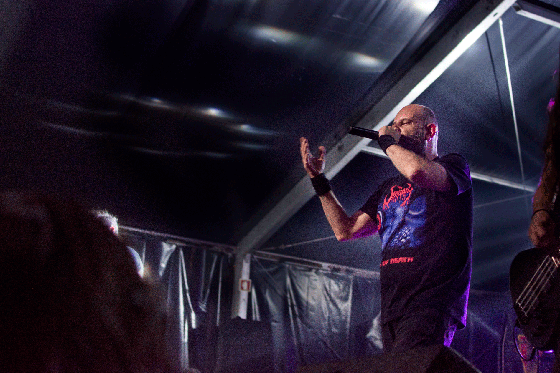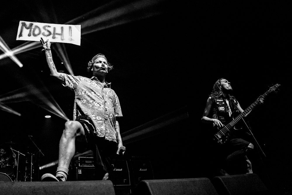 Há mais de três décadas alguém arranjou um lugar no Guinness Book of World Records para os Napalm Death por terem escrito a canção mais curta do mundo. Chama-se «You Suffer» e, na altura, apresentava algum do “ruído” mais infernal alguma vez registado em vinil. Abriu-se ali o caminho para um género, o grind, replicado e extremizado vezes incontáveis desde então. De há umas décadas a esta parte, estes finlandeses transformaram-se numa das propostas mais interessantes saídas da segunda geração da tendência e, com várias passagens por Portugal, são já bem conhecidos pelo público do SWR – onde voltaram este ano, com novo álbum da bagagem, o corrosivo «Apocalypse», para fecharem com chave de ouro as actividades no palco principal. Não é crível que alguém ali estivesse à espera de nenhuma revolução porque, quando toca a estes dudes, não há que enganar – o que servem é uma descarga de proporções colossais. E sim, são daquelas bandas cujo apelo nunca ninguém na casa dos 40 anos vai conseguir explicar aos seus pais, mas para quem está por dentro, não há melhor “castanhada”. Com os pés bem firmes em terreno testado e caminhado com sucesso, ainda assim há uma intensidade inabalável na amálgama de grind, crust e death metal enegrecido e grind que os Rotten Sound apresentam. A descarga atingiu com uma força tremenda a multidão, nesta altura a queimar os últimos cartuxos, com as crescentes ondas de som distorcido a inspirarem um headbanging espástico. Verdade seja dita, nesta ocasião tiveram o público na mão desde o primeiro momento, com o simpático Keijo Niinimaa – que, uns minutos antes, estava ali ao nosso lado na plateia a observar atentamente o tio Tom G. – a comandar as tropas com punho de ferro e um rugido impotente. Sem surpresas, dividiu-se entre gritos de rasgar a garganta e o seu característico grunhido grave, além de ter confirmado a ideia de que é um MC de excelência. Entre elogios ao SWR, mostrou-se grato por estar finalmente de volta e, claro, conquistou a simpatia dos presentes. Com um volume ensurdecedor, o quinteto cuspiu tema após tema de forma impiedosa, com as descargas de blastbeats pulverizantes, os grooves e som de guitarra à Entombed e o ocasional colapse sludge a propagarem ondas de caos pelo recinto. Com os dois temas iniciais, «Pacify» e «Equality», e mais uns quantos (como o single «Renewables») lá mais para a frente no setlist, forneceram uma representação variada do novo álbum, mas na verdade foram as canções mais antigas, como «Power», «Targets», ou «Slay», que atrairam os espectadores mais desordeiros para algo familiar. Apesar do tamanho do palco, mostraram-se cheios de energia, a tocar e a cambalear de um lado para o outro, num headbanging furioso. Cá em baixo, com o mosh pit ali a uns centimetros, a vibração não estava muito diferente, por isso quando o bom do Keijo diz que vão tocar “uma música para todos”, está tudo numa sintonia tão pouco provável que se percebe que não está a brincar. Isto é uma festa grindcore e todos estavam convidados – no SWR compareceram em massa e, figurativamente, os Rotten Sound abalaram os alicerces da tenda. [J.M.R.]