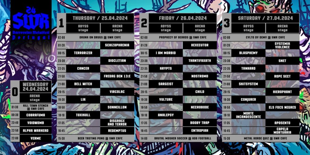 O cartaz, que pode ser visto em cima, fica completo com ANALEPSY, HEXECUTOR, NECROBODE, COBRAFUMA, APOSENTO, MORTE INCANDESCENTE, SYSTEMIK VIOLENCE, CHILD, ELS FOCS NEGRES, BOOBY TRAP, DISGRACE AND TERROR, TOXIKULL, REDEMPTUS, SONNEILLON, CAPELA MORTUÁRIA, ENTROPIAH, ALPHA WARHEAD, VERME e ainda VOIDWOMB. Os ingressos continuam disponíveis na loja virtual do SWR – Barroselas Metalfest, assim como nos pontos de venda oficiais, e os horários das actuações já podem ser “estudados” em baixo..