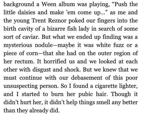 De acordo com a passagem do livro assinado por Manson em parceria com o jornalista Neil Strauss, que pode ser vista em baixo, o incidente aconteceu na noite antes de Reznor contractar o shock rocker para a sua editora, a Nothing Records. No entanto, o líder dos NINE INCH NAILS, que produziu o álbum «Portrait Of An American Family», de 1994, afirma que a situação relatada nunca aconteceu. “Ao longo dos anos sempre falei abertamente sobre a minha antipatia pelo Manson como pessoa e cortei relações com ele há quase 25 anos“, diz o músico norte-americano à Pitchfork. “Como disse na época, essa passagem contida nas memórias do Manson é uma invenção completa. Fiquei furioso e ofendido quando o livro foi publicado e continuo assim até hoje.“