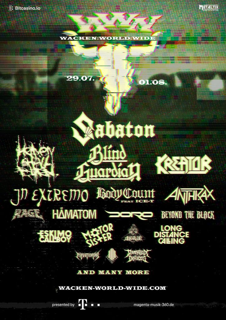 À semelhança de tantos outros eventos originalmente agendados para este Verão, em 2020 o mítico WACKEN não será Open Air. Cancelado em Abril, o maior festival de metal do mundo incluía no cartaz nomes como os JUDAS PRIEST, AMON AMARTH, SODOM, MERCYFUL FATE, HYPOCRISY, VENOM e DEATH ANGEL, entre muitos outros, sendo que os ingressos já estavam esgotados desde 2019. Pois bem, já que o formato habitual foi adiado para o próximo ano devido à pandemia do novo Coronavírus, a equipa do W:O:A anunciou a realização de uma edição virtual, que decorrerá entre os dias 29 de Julho e 1 de Agosto. Apelidado WACKEN WORLD WIDE, o evento online incluirá a transmissão de espectáculos de bandas como os KREATOR, BLIND GUARDIAN, HEAVEN SHALL BURN, BEYOND THE BLACK e IN EXTREMO, entre muitos outras que ainda serão anunciadas. Para assistir ao evento, basta acederes ao site MagentaMusik 360 ou ao site oficial. Hoje, quarta-feira, 22 de Julho, foi divulgada a programação detalhada para o primeiro dia de transmissões, que vai contar com actuações dos SABATON, BLIND GUARDIAN, KREATOR, HEAVEN SHALL BURN, IN EXTREMO, BODY COUNT, ANTHRAX e RAGE, entre muitos outros. A seu tempo, todas as restantes informações vão ser atempadamente divulgadas no site e nas redes sociais do WACKEN WORLD WIDE.