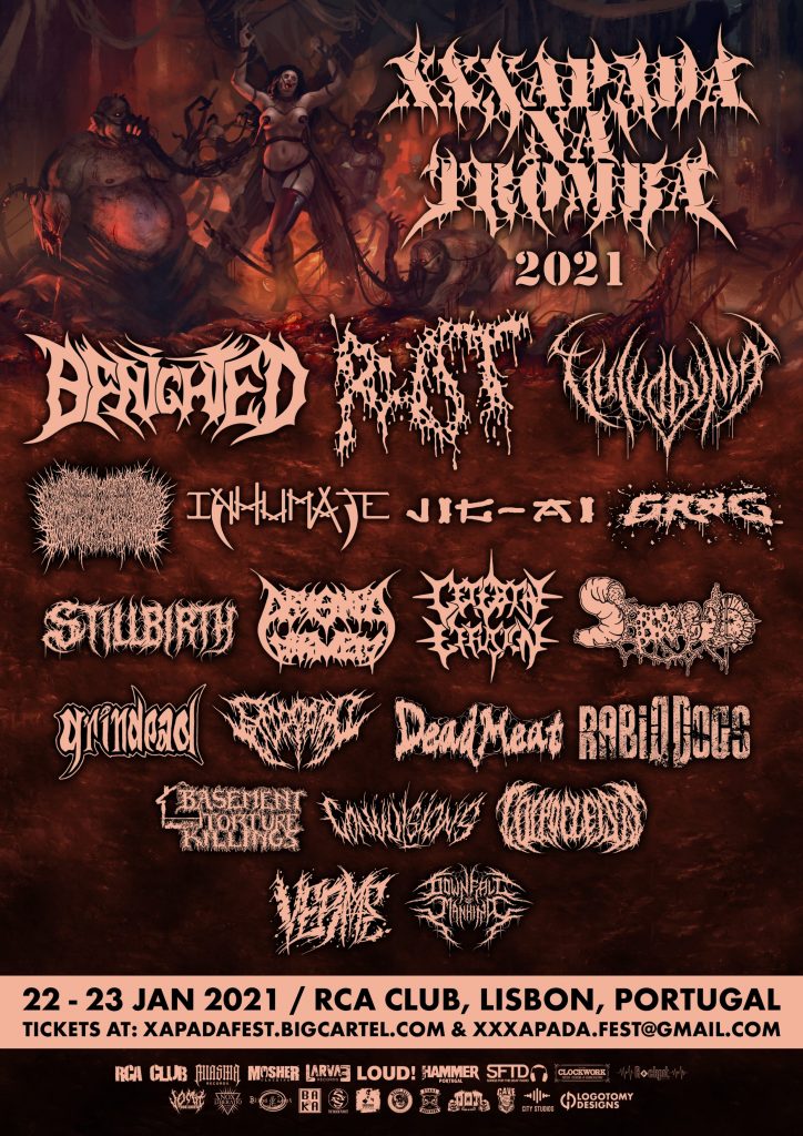 Enquanto a ausência de concertos se mantém, continuam os anúncios para Outono/Inverno. O festival XXXAPADA NA TROMBA, que é já um hábito de Janeiro e em 2021, regressa nos dias 22 e 23 de janeiro ao local habitual – o RCA Club, em Lisboa. Os nomes do festival já começaram a ser adiantados, sendo os franceses BENIGHTED, o nome mais forte na edição deste ano. Além destes, para já as presenças asseguradas passam pelos brasileiros ROT, VULVODYNIA, da África do Sul, INHUMATE, França, JIG AI, da Républica Checa, um misto de músicos alemães e da África do Sul denominado Xavlegbmaofffassssitimiwoamndutroabcwapwaeiippohfffx, os alemães STILLBIRTH, EXCORIATION, da Rússia, ABYSMAL DAWN, TORMENT, de Malta, RABID DOGS, de Itália, CEREBRAL EFFUSION e CONVULSIONS, ambas de Espanha, bem como COLPOCLESIS e BASEMENT TORTURE KILLINGS, do Reino Unido. Dos nomes nacionais, as escolhas neste ano foram para GROG, SERRABULHO, GRINDEAD, DEAD MEAT, VERME e DOWNFALL OF MANKIND. A organização promete para breve, mais surpresas relativamente ao cartaz e a esta próxima edição do festival. Os bilhetes para os dois dias do festival vão estar à venda com o preço “early bird” de 40€ — estando esta promoção limitada a apenas 50 unidades – e depois o preço passa para 45€. Os bilhetes diários serão colocados à venda mais tarde. Estes encontram-se disponíveis para já em xapadafest.bigcartel.com e xxxapada.fest@gmail.com