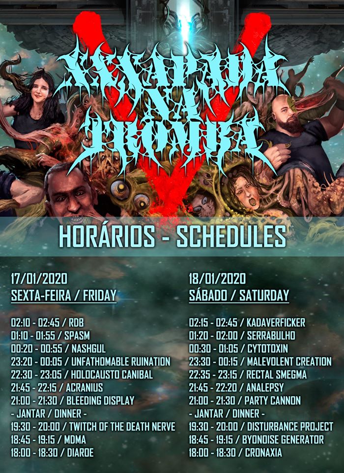 Arranca já hoje a quinta edição do XXXAPADA NA TROMBA – FREAK N’ GRIND FEST, que terá lugar a 17 e 18 de Janeiro no RCA Club, em Lisboa. A edição deste ano tem como atracção principal os norte-americanos MALEVOLENT CREATION, sendo que se juntam mais dezanove nomes aos lendários death metallers da Florida. Pelo palco da sala lisboeta vão passar também os UNFANTHOMABLE RUINATION, SPASM, RECTAL SMEGMA, CYTOTOXIN, NASHGUL, ACRANIUS, KADAVERFICKER, TWICHT OF THE DEATH NERVE, PARTY CANNON, BYONOISE GENERATOR, MDMA, DISTURBANCE PROJECT e DIAROE. A todos estes nomes internacionais, juntam-se ainda os portugueses HOLOCAUSTO CANIBAL, SERRABULHO, ANALEPSY, RDB, BLEEDING DISPLAY e CRONAXIA. Os horários das actuações podem ser consultados em baixo.